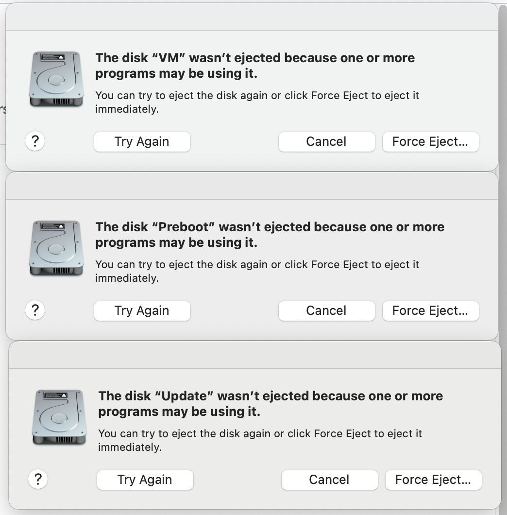 Macintosh HD-Data appears on my desktop top along with Macintosh HD. Force ejected VM, Preboot, and Update, to eject the disk. Attached are the text files for diskutil before the force eject, and after.