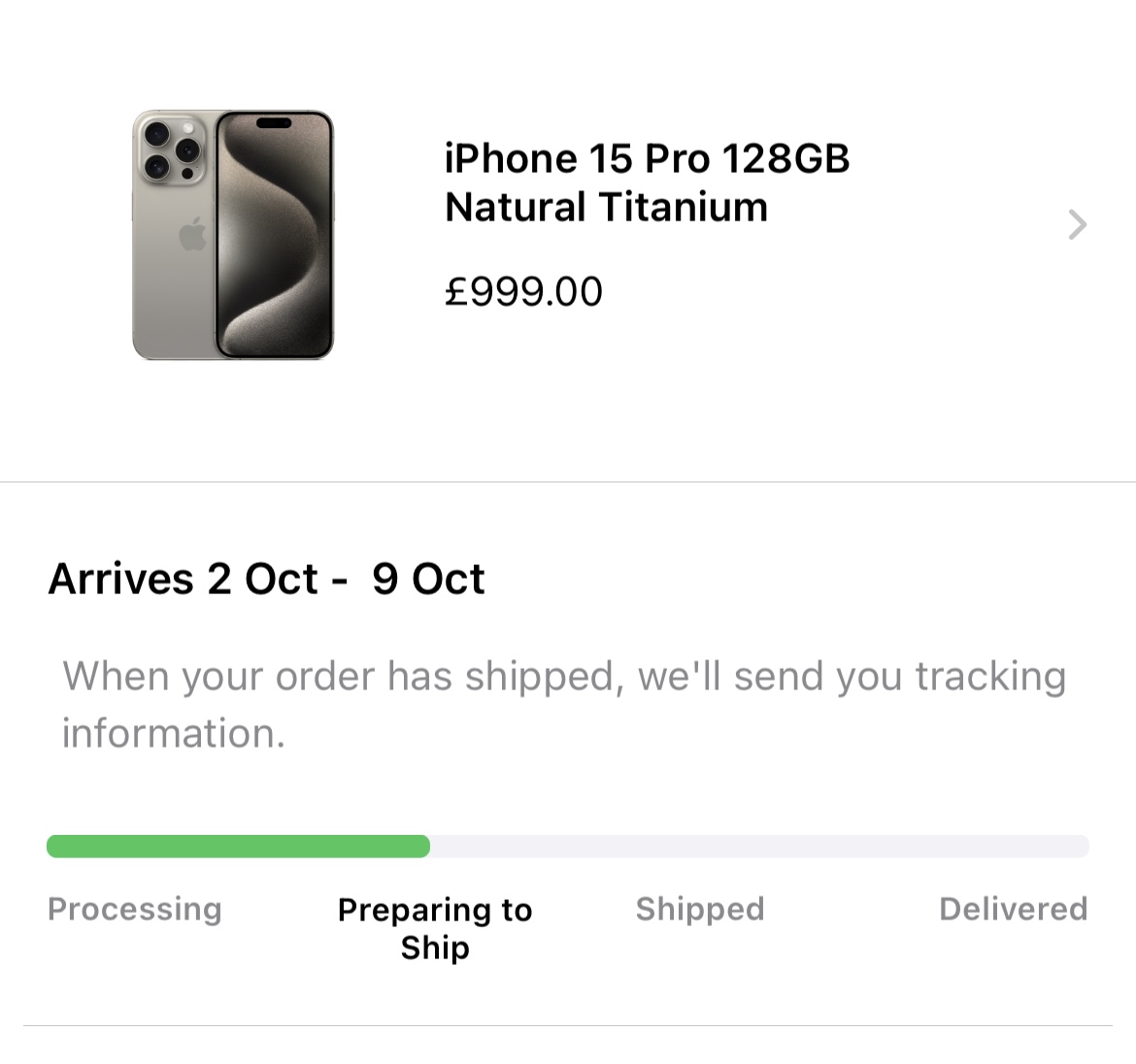 I had dramas on pre order and couldn’t get on until about 1.15PM, by which time the window had slipped to 27th September to 2nd of October.Standard Pro, 128GB Natural Titanium. Apple tend to underestimate and over deliver to my knowledge, so was hopeful that some traction would have happened by now.