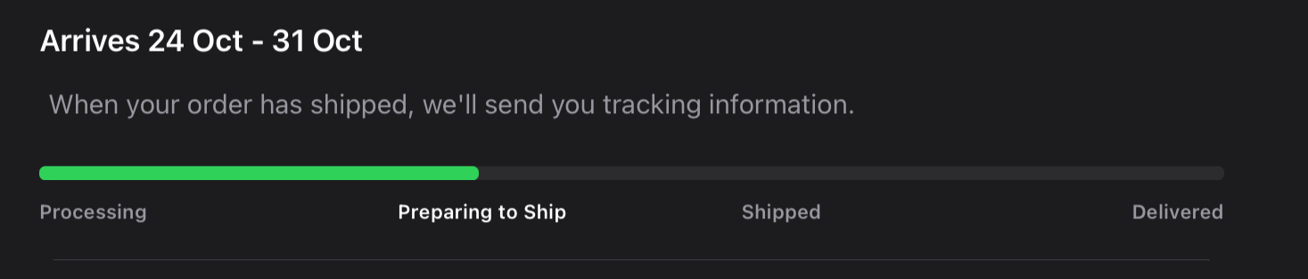 To save your blood pressures, the green bar is meaningless - it only moves in relation to the label changing. If you look in the code of your order, you'll see a `currentStatus` key. Once that changes, the green bar will move, and it will look slightly different depending on your device, screen, browser size etc. I have a script checking mine every minute, because I'm a giant loser, which one day I may make available to other Apple losers to save the whole Green Bar Envy and keep everyone up to date on their extravagant purchases :)