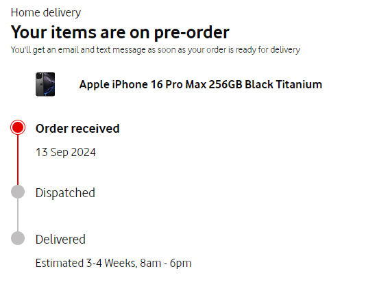 Bought the 16 pro max outright, 256gb gold colour whatever it's called, yesterday on the 18th September as it started 20 September delivery. Got confirmation email which also stated 20 September while confirming the order went through. An hour later a follow up email states 17 October. Pissed, but I should have known.