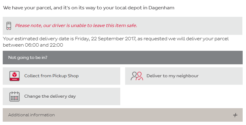 Mine is coming from the Dagenham Depot aswell, But I don't get the pickup shop option only deliver to neighbour or change date.Yep, you're right about the safe place, however my tracking page allows to select to deliver to a neighbour - I can go through all the steps short of pressing Submit