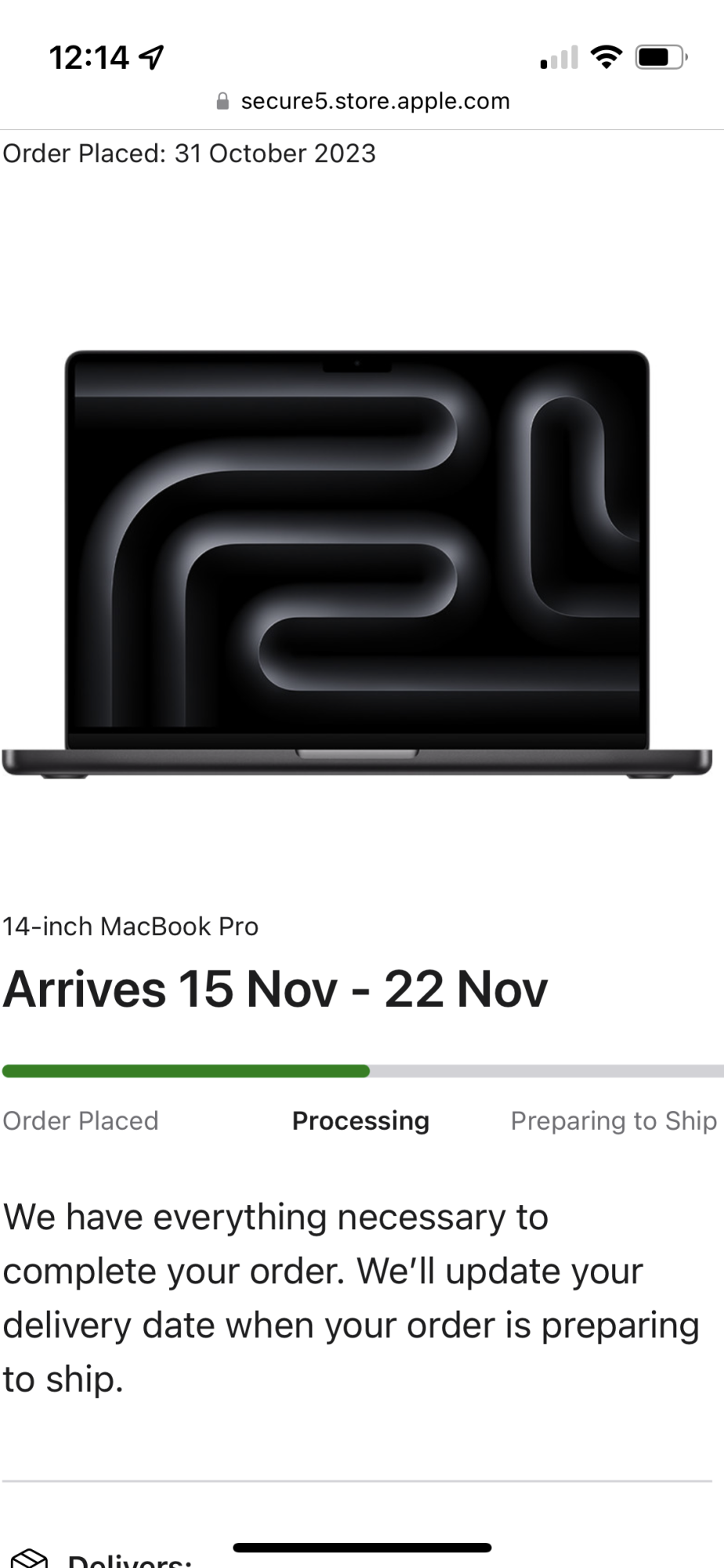 Mine took payment this morning, so that’s a good sign even though still says processing. How about yours?Anyone had a shipped 14 M3 Max in UK yet? , mine says delivery 15- 22 Nov but still on processing
