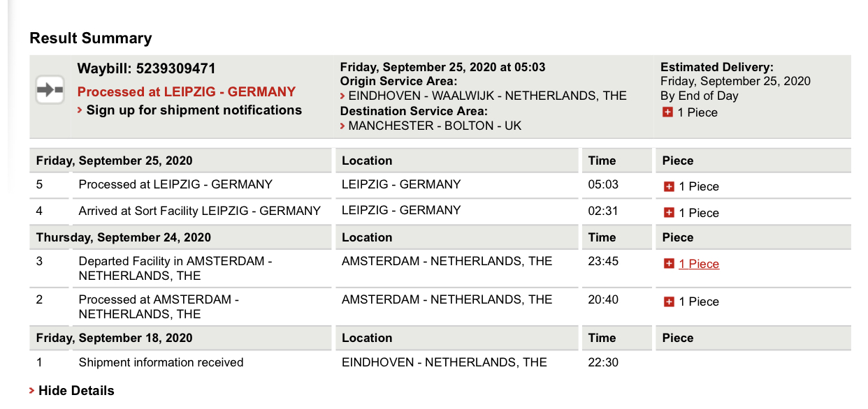 Your tracking page looks much more promising than mine. I’ve landed in Heathrow but it’s been put on hold and hasn’t reached a delivery depot yet.