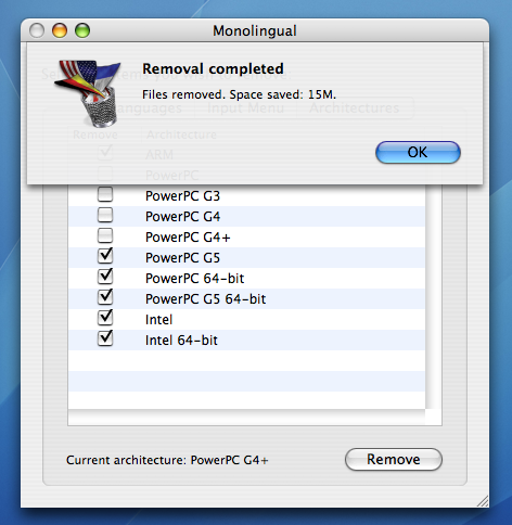 Run Monolingual 1.3.9 (download on the PPC Archive Utilities page) and click “Run”