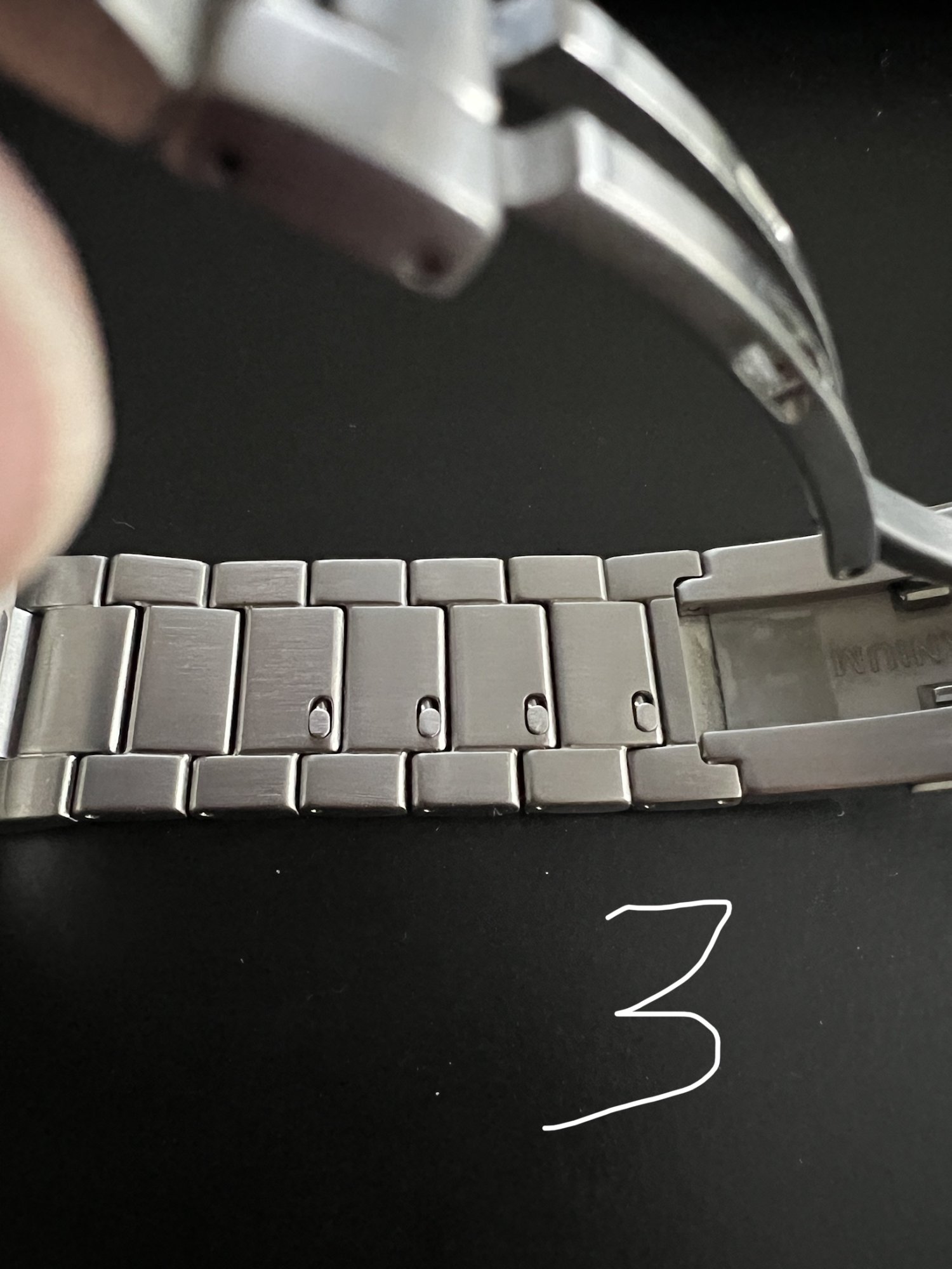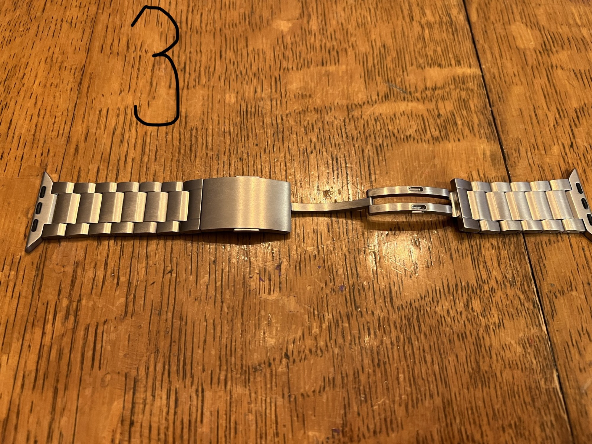 1. NewWays Titanium Band ($28). The color is a pretty good match. The band is stiffer than the other two. You press pins to remove links, which are all the same. This band is the heaviest at 69g. I think this band has the least amount of titanium.