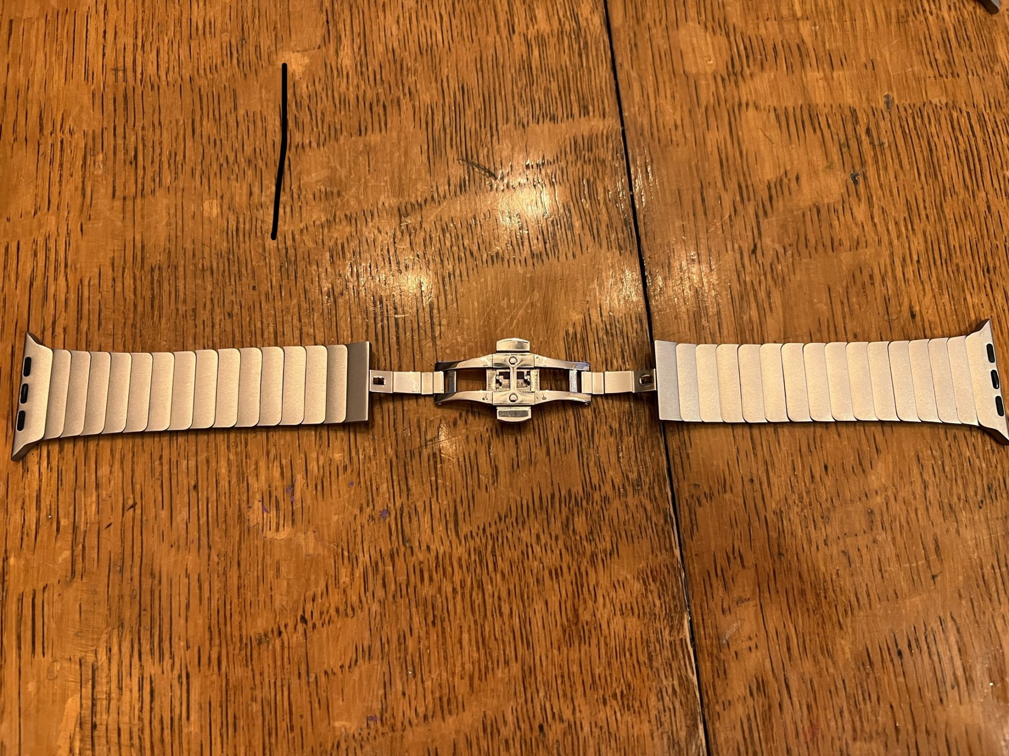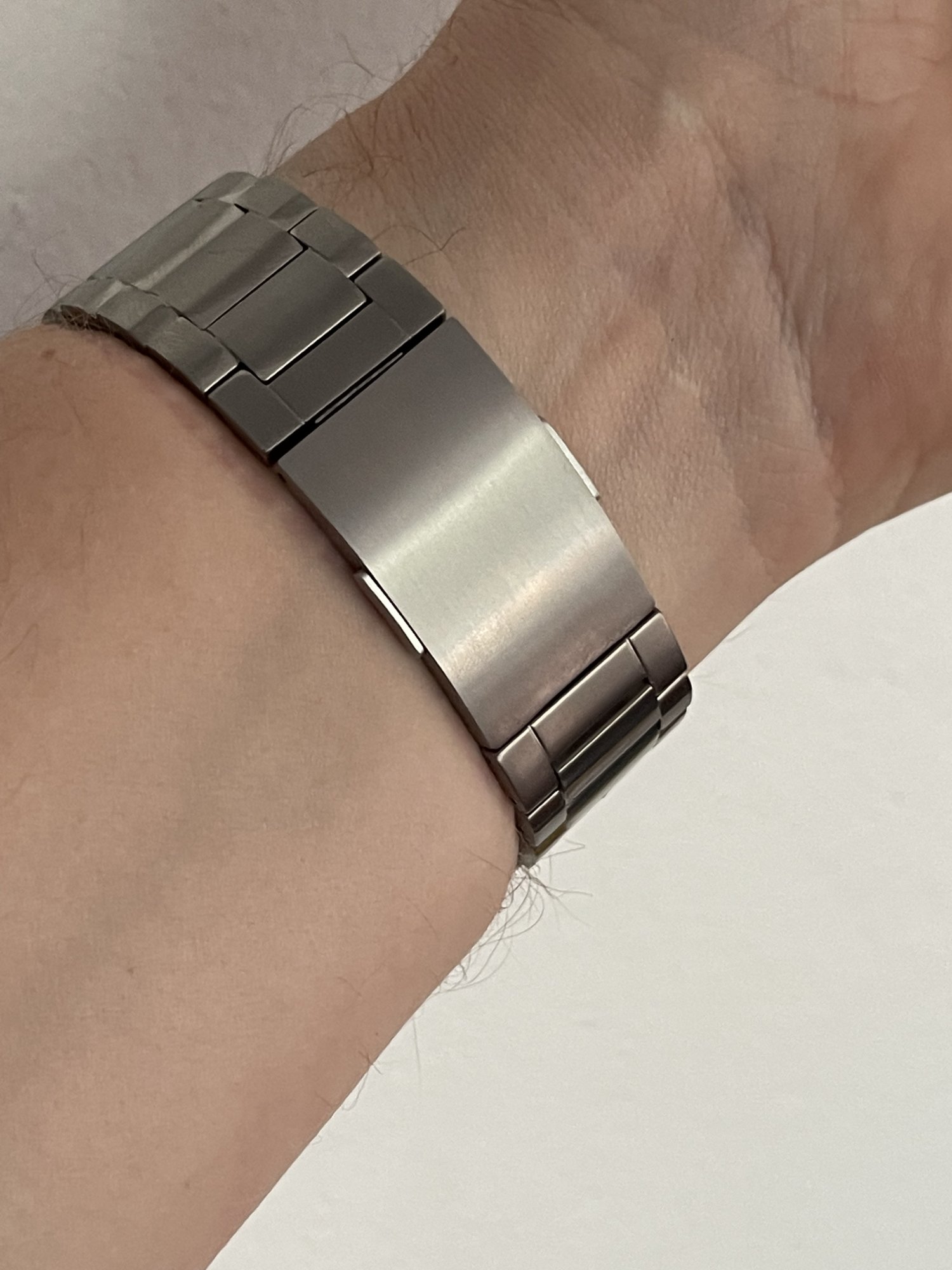 3. LDFAS New Titanium Band ($70). This band was released after the Ultra came out. It is the best match for color. This band has very slim clasp and is as comfortable as number 2. The links are cut differently than number 2 and are thicker. The links are removed using a spring button on each, so no tools are needed. There are also two half size links on this band as well. This band is the lightest, thus I feel it more titanium than the others, at 52g. Obviously it is twice as expensive.