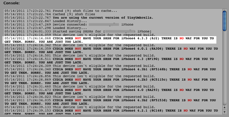 Here's the problem: I wanted to make sure I save the 4.3.3 SHSH for this new device, but Tiny Umbrella says it's too late to save 4.3.3 (see attached). How can this be?