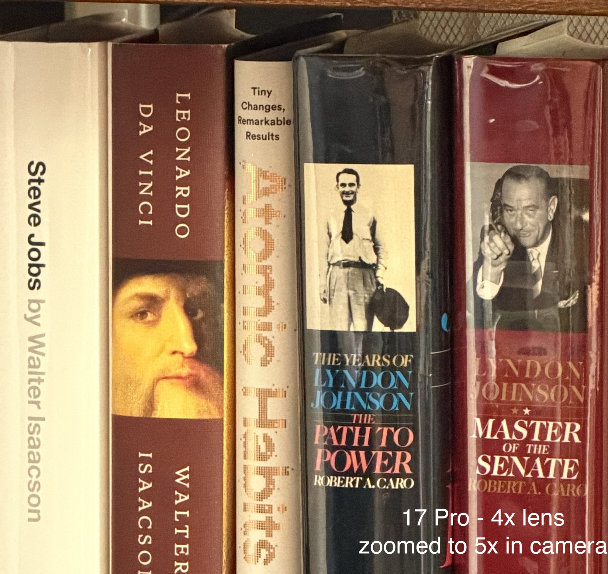 - The 4x lens on the 17 Pro zoomed in to 5x captures more detail than the optical 5x lens on the 16 Pro. I attribute this to the higher res sensor on the 17 capturing more information. The 17 Pro also still produces a 24 MP image at 5x, which makes me think it's doing the same processing trickery that allows the 1x lens to still get 24 MP images at 28mm and 35mm equivalents. That's a nice bonus since the 16 Pro still captures a 12 MP image at 5x. Here's a comparison shot of the 17 Pro 4x zoomed to 120mm equivalent (the same field of view on the 16 Pro 5x). At first glance they look similar. But then as you zoom in, you see the 17 Pro was able to pick up things like the texture of the paper on the Da Vinci biography. It was able to resolve that the word Atomic is made of small dots in the next book to the right. And smaller letters and fine details are just crisper throughout the image. Much of that is probably due to the extra resolution of the 17 Pro sensor. There is also just less noise in the 17 Pro image. I couldn't post the full 17 Pro image here because it's 24 MP but here's the comparison of a sampled area of the image.