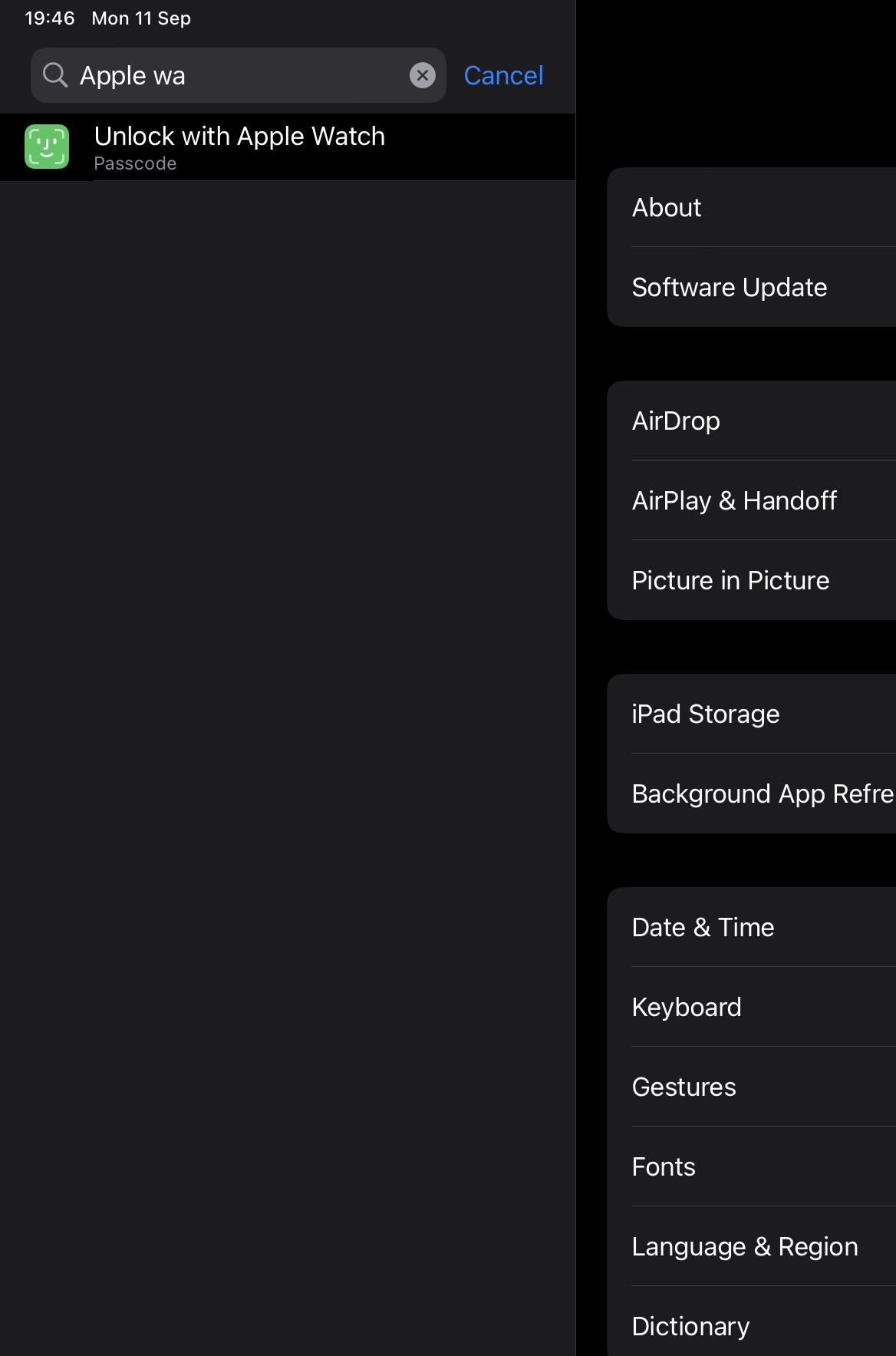 It's a bit niche but I thought I would see if I could set my iPad Pro to unlock when I was nearby with my Apple Watch on. Search in settings and it appears but it isn't visible on the actual settings page the search links to. Is this a bug or intentional?