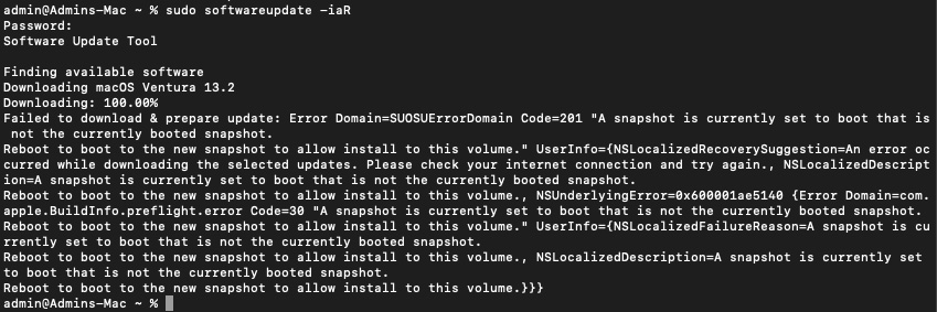 Reboot to boot to the new snapshot to allow install to this volume.”