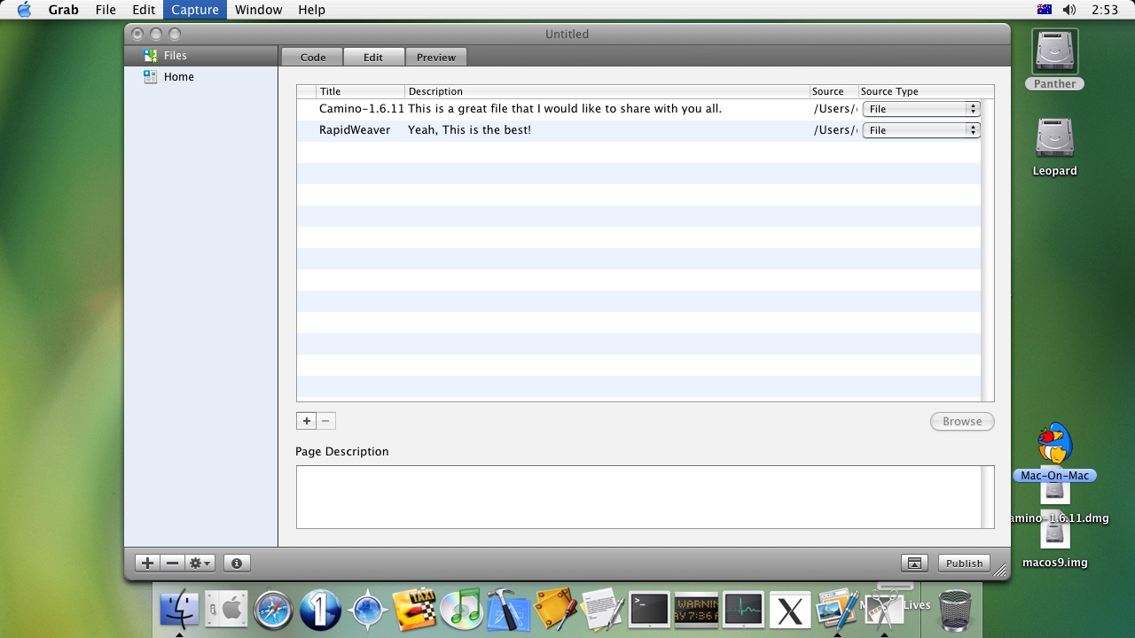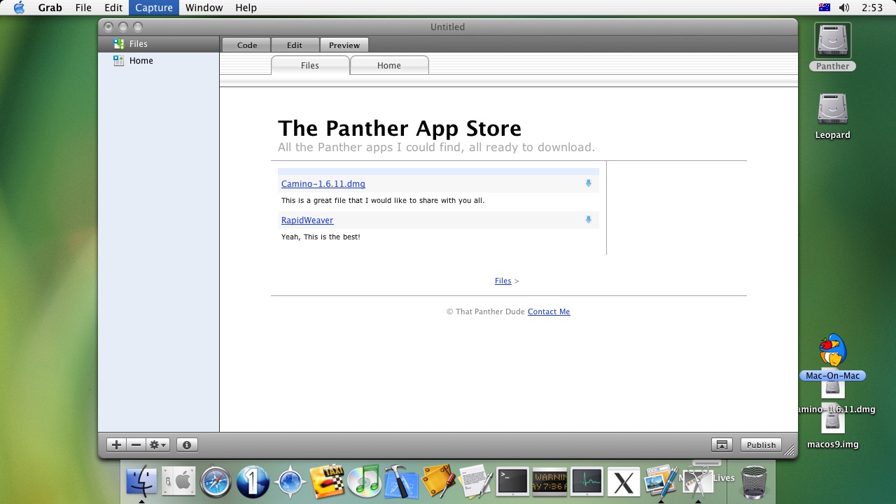 I had a quick play with the RapidWeaver 3.5.0 demo on my mini running Panther and it is super easy to use. You could setup a website with download links for all of your files within a few minutes. You would just need to host it all somewhere.
