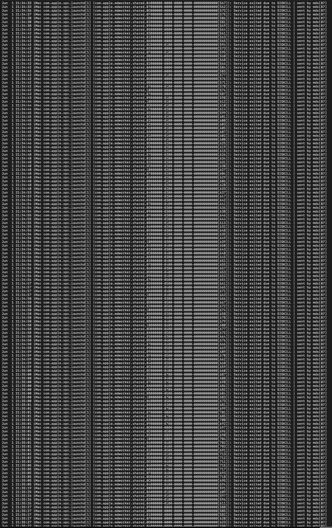 Jul 16 14:43:34 Erics-MBP com.apple.xpc.launchd[1] (com.apple.mdworker.shared.0F000000-0200-0000-0000-000000000000[1738]): Service exited due to SIGKILL | sent by mds[1505]