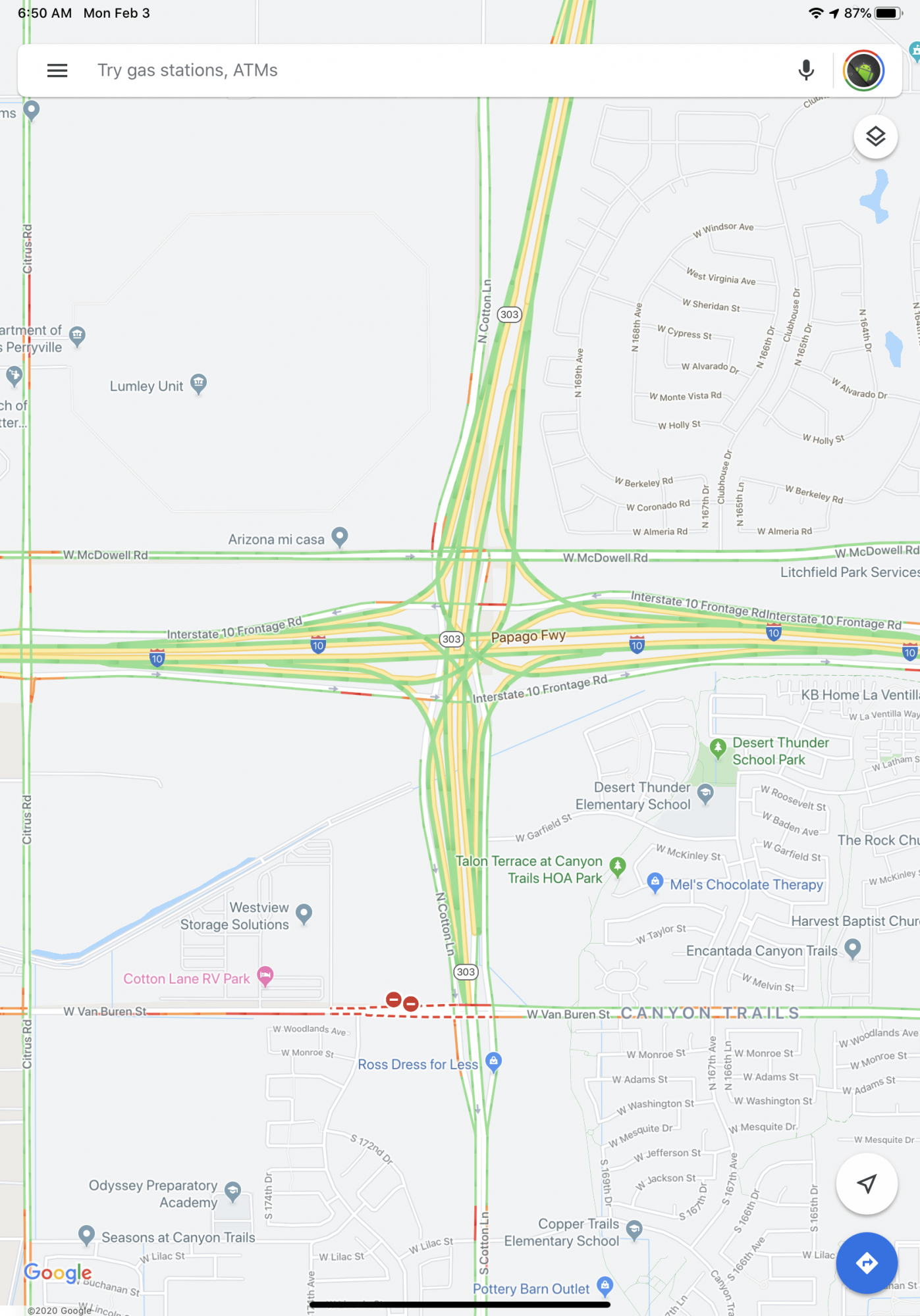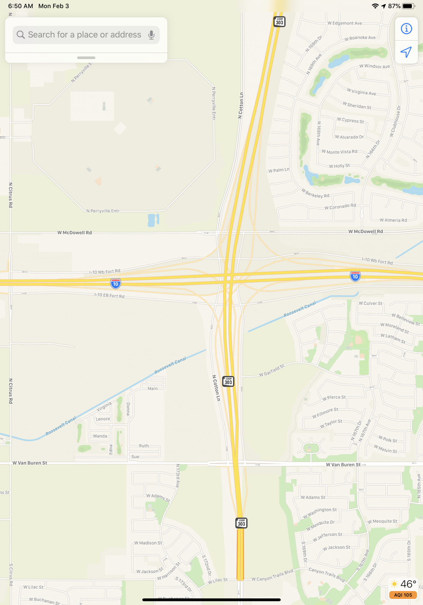 I-10 and the 303 in Arizona. Both are okay however the contrast in Apple Map leaves much to be desired. Also note the road closure that is missing in Apple. Definite contrast in detail from the Apple view at the Sports Complex.