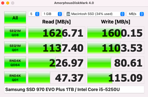 I decided it was time to upgrade storage on my MacBook Air, so I bought a 500GB Crucial P2 NVMe 2.0 SSD and installed it with a Sintech adapter. Everything is running fine, and I don't really notice a difference in performance, but when I went to check the drive speeds using Blackmagic Speed Test I realized that the new drive was underperforming by a significant amount. With my original MacBook drive I was getting 400-600 mbps write speeds with ~1200 mbps read speeds. Now, with the new drive, I am getting <400mbps write speeds with ~400 mbps read speeds(The drive is rated to have up to 2400 mbps speeds, and I've seen people on the internet running the exact same drive at 1200mbps write and read speeds on their upgraded macbooks). To be quite honest I don't mind this since I don't feel a difference in performance, but I am concerned that either the adapter, new SSD, or my mac are faulty in some way. Has anyone here experienced similar issues, or know the possible cause of mine?