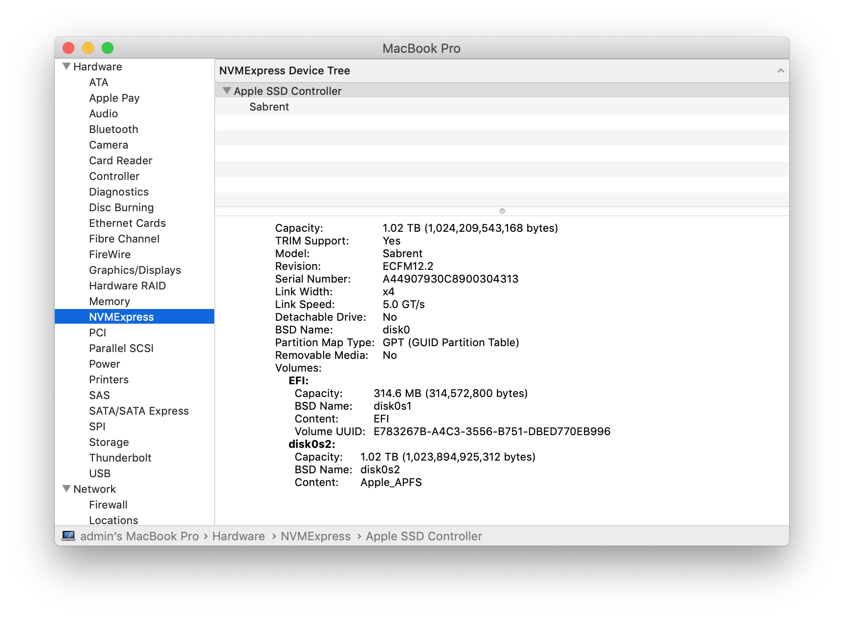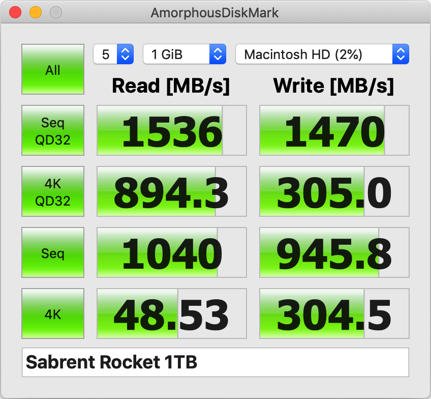 I'll retest the Sabrent with BlackMagic and Amorphous when I get the chance, now I've migrated data onto it. I wanted to do tests with a clean install and simple account set up, just to check speed. These have been pretty positive; it seems I've got Link Width x4 and Link Speed of 5.0 GT/s, which I'm guessing is PCIe 2.0 4x. Sabrent 'revision' is 'ECFM12.2', so seems to be the latest Phison E12 12.2 firmware. Speeds on the Apple SSD actually seemed to improve moving to Mojave from Sierra; APFS perhaps? Sabrent seems to be roughly 65-90% faster than the Apple SSD.