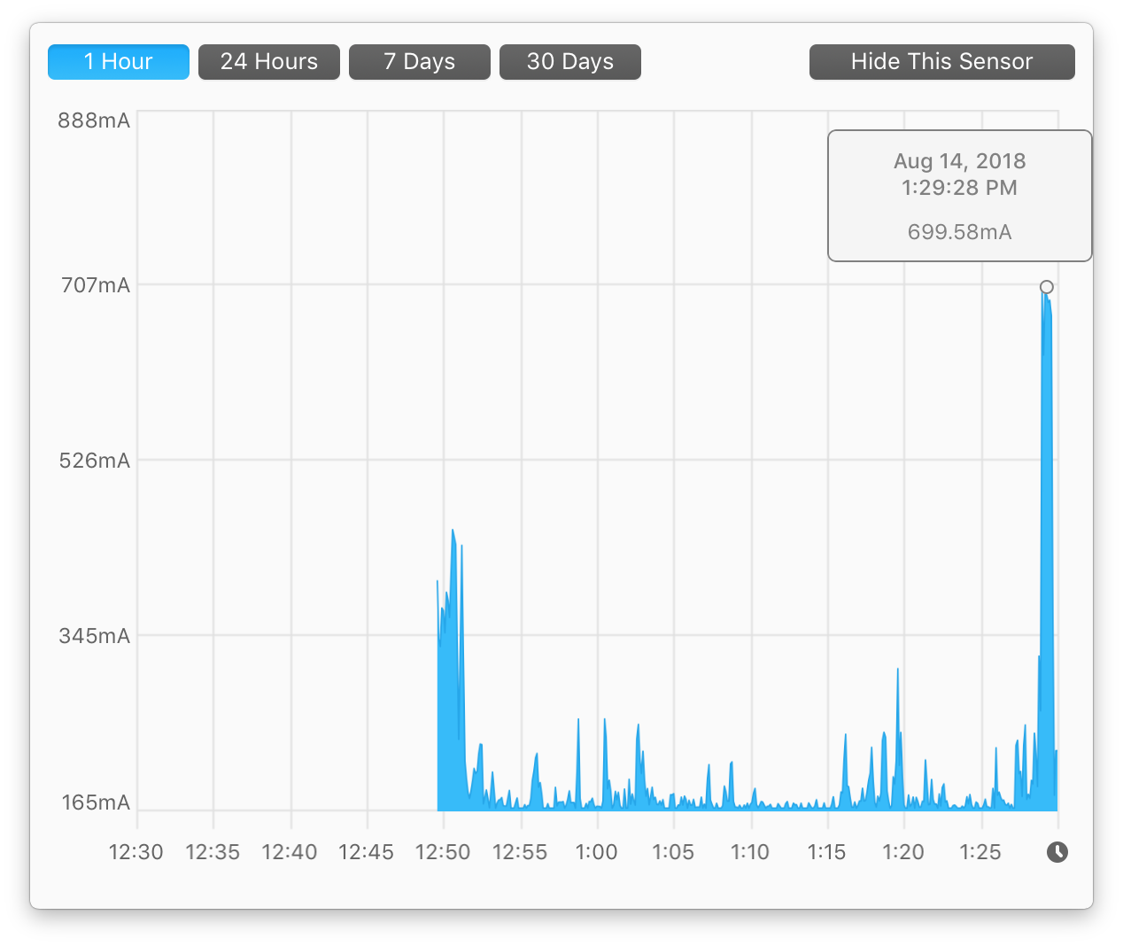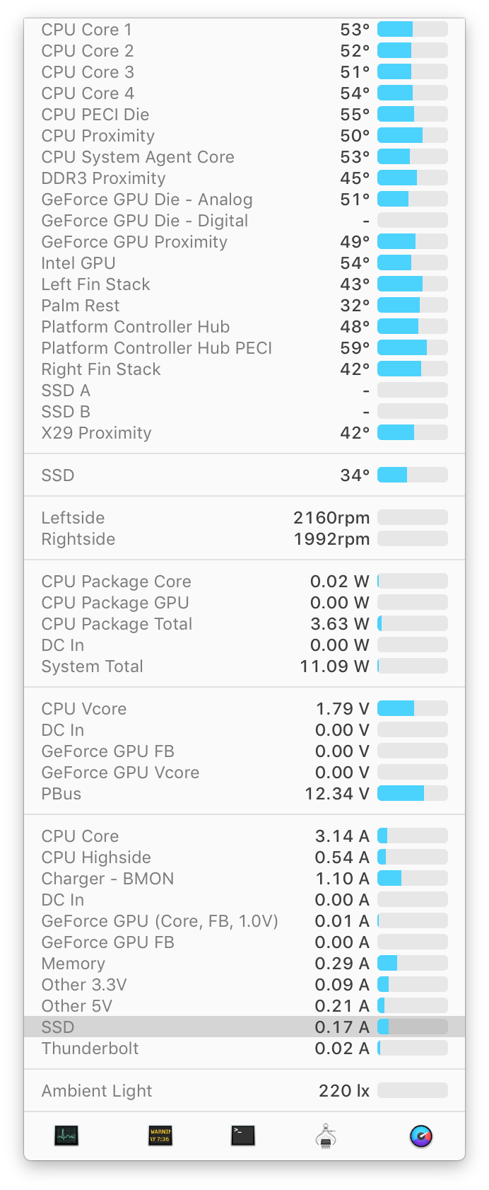 The 960 EVO idles at around 0.40A average (you could see from the picture below it spikes up and down between 0.36A and 0.53A while it's idling and spikes up to 1.0A-1.4A during full use (running Blackmagic disk test).