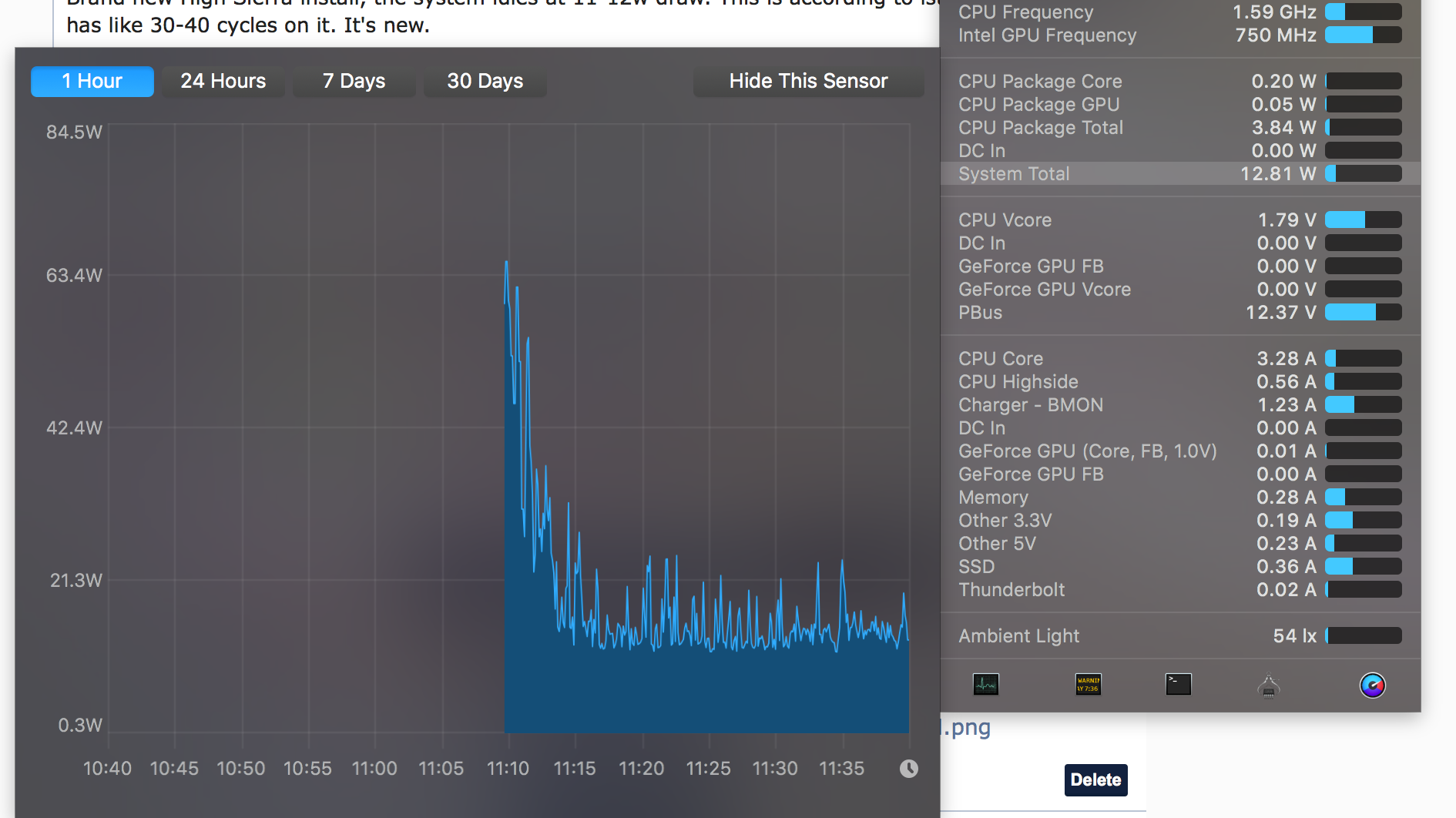 Brand new High Sierra install, the system idles at 11-12w draw. This is according to istatmenu. My battery has like 30-40 cycles on it. It's new.