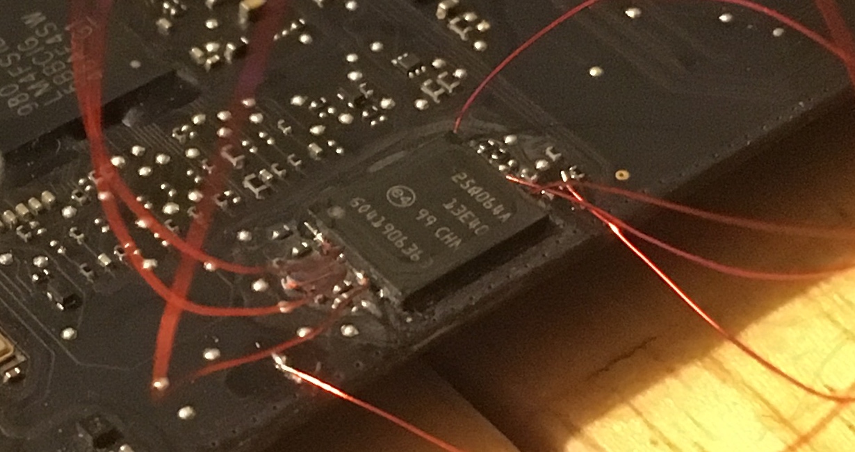 Looks like I may have bricked my Late 2013 MBP 15” in an attempt to patch the NVMe driver in the bootrom. The patching seemed to go fine with flashrom, following the steps exactly as described in the post in the wiki. However, the MacBook doesn’t boot. I even reversed the patch and rewrote the original (backed up) copy of the rom image back to the chip, but the MacBook still won’t boot.