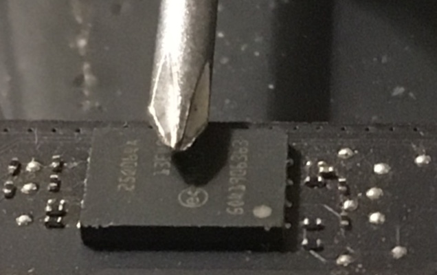 This wound up being a little trickier, since my Mac doesn't have the J6100 connector installed for some reason, and its EFI chip is not an SOIC-8 chip like the 15" models have. This meant that I couldn't use an SOIC-8 clip on it, but I was able to solder some 34AWG magnet wire onto the pins and get it recognized by a CH341a. (I later found out that, if I had desoldered the chip, it has the same spacing as the SOIC-8 and would have fit perfectly into the clip...)