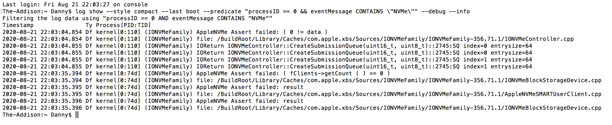 log show --style compact --last boot --predicate "processID == 0 && eventMessage CONTAINS \"NVMe\"" --debug --info