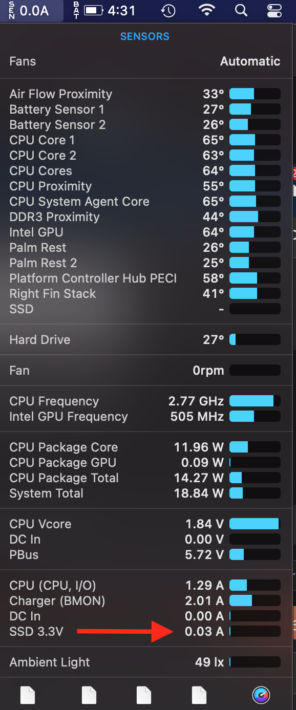 Placed the 500 GB SSD back in the MBA of my daughter, all still worked well. Reinstalled my 2 TB Intel 660p NVMe SSD in my rMBP 2015 13" (with short Sintech adapter). Checked SSD power usage when running on battery. Enabled Intel Power Gadget first (only required for CPU readings). Booted. After some minutes the idle current for the SSD dropped to 0.00A. Measured with iStat Menus version 6.51 on battery power.