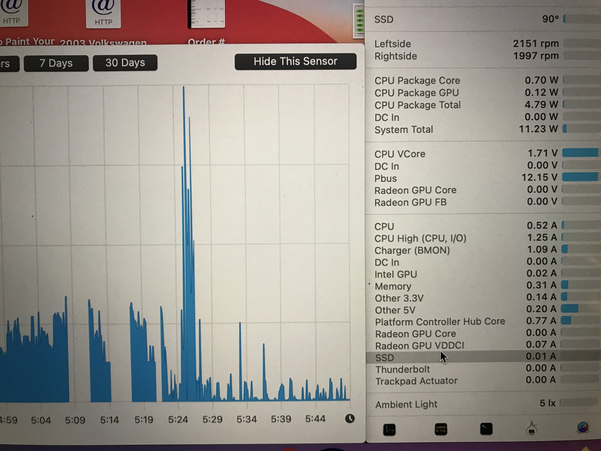 What I have noticed about 0.00A readings, however, is that with my usual cadre of apps open, it’s pretty rare. If I close everything out to try and minimize disk access, 0.00A is logged much more frequently. Additionally, while it isn’t really evident from the detailed graph, it does seem some small, yet non-zero amount of current is being drawn when 0.00A is displayed. If I watch the sensor dropdown from the menu bar, and not drill down into the graph proper, the bar next to “SSD” does oscillate between showing a sliver of blue and then nothing while reading as 0.00A. I’ve also noticed roughly a 6°C drop in idle temperature of the SSD in this state vs not having any of the kexts installed at all, from 37°C on average to 31°C. Without Bjango updating iStat to show more precision in readings, it can’t really be fully proven what I’m seeing I suppose, but I’m not convinced it’s a glitch. (This is all again regardless of power source, I consistently see the same behavior plugged in)