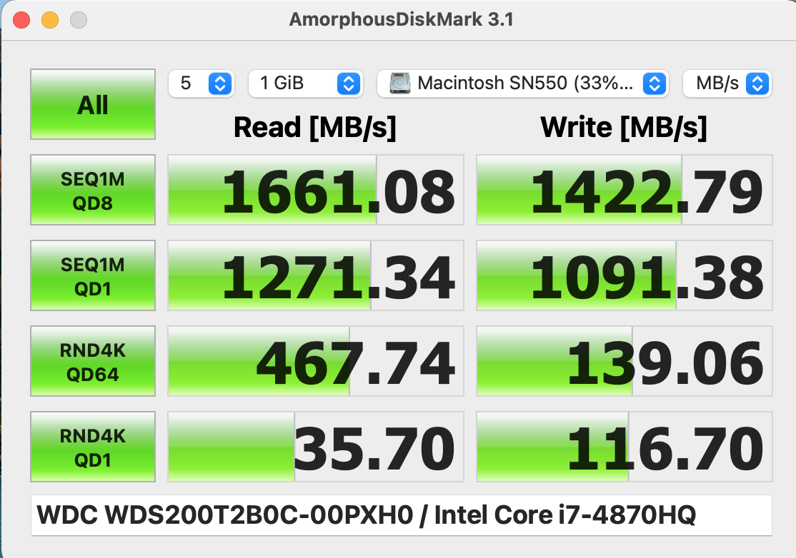 I just installed the 2TB SN550 on my MacBook Pro 15 mid-2014 (MacbookPro11,2) and I am getting Write ~800MB/s and Read ~1450MB/s after some interactions. I guess the Write speed reflects the fact that the SN550 is DRamless, but