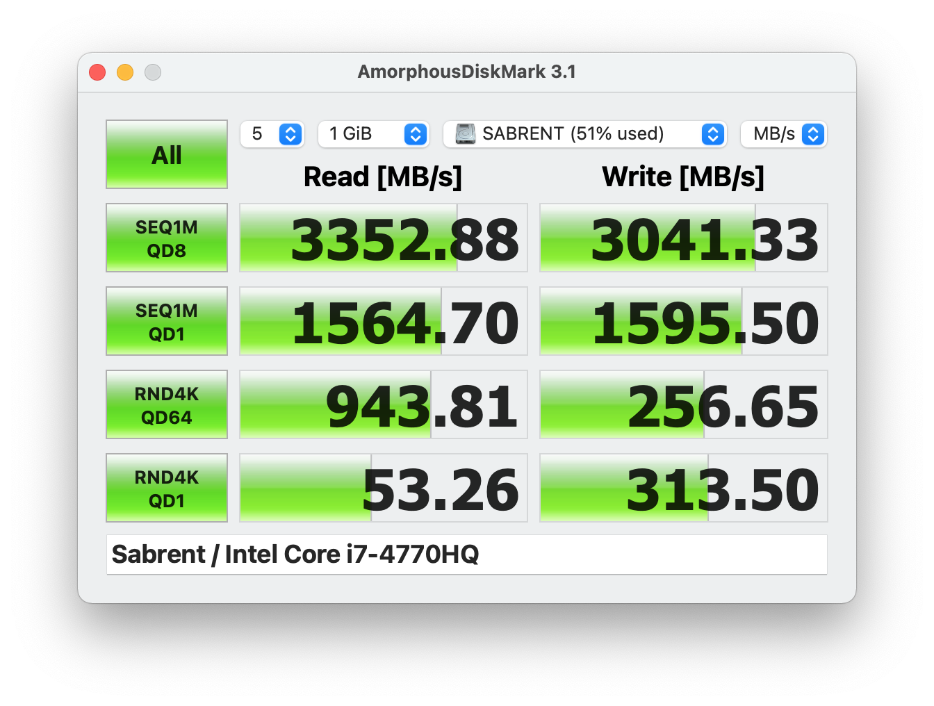 The performance is great with benchmark figures better than any others that I have seen in this thread. When I upgraded my 2014 MBP I used a 2TB Apple SSD that cost over £500. It's great but not as fast as this Sabrent SSD. The mid-2015 MBP has the advantage of PCI 3.0 so it may well be that the Sabrent would be no faster in the 2014 MBP. The other advantage of the mid-2015 MBP is that there is no need for extra kexts or other hacks to save power. Finally& the reason why I bought it that it is supported running Monterey. Last night the battery charge dropped from 98% to 94%. Mac fan control tells me that the Sabrent disk got up to 32C during my benchmarking.