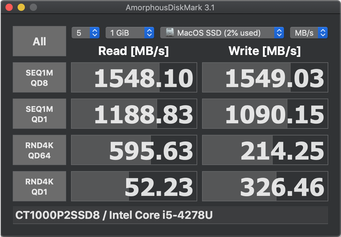 You're running a MBP 2014, so it has PCIe 2.0, so it's limited to around 1500 Read/Write and you're getting that. From a speed standpoint, the P2 is a good choice, because your computer can't do more than about 1500 anyway, so getting a drive that could do, say, 7000 MB/s would be a total waste.