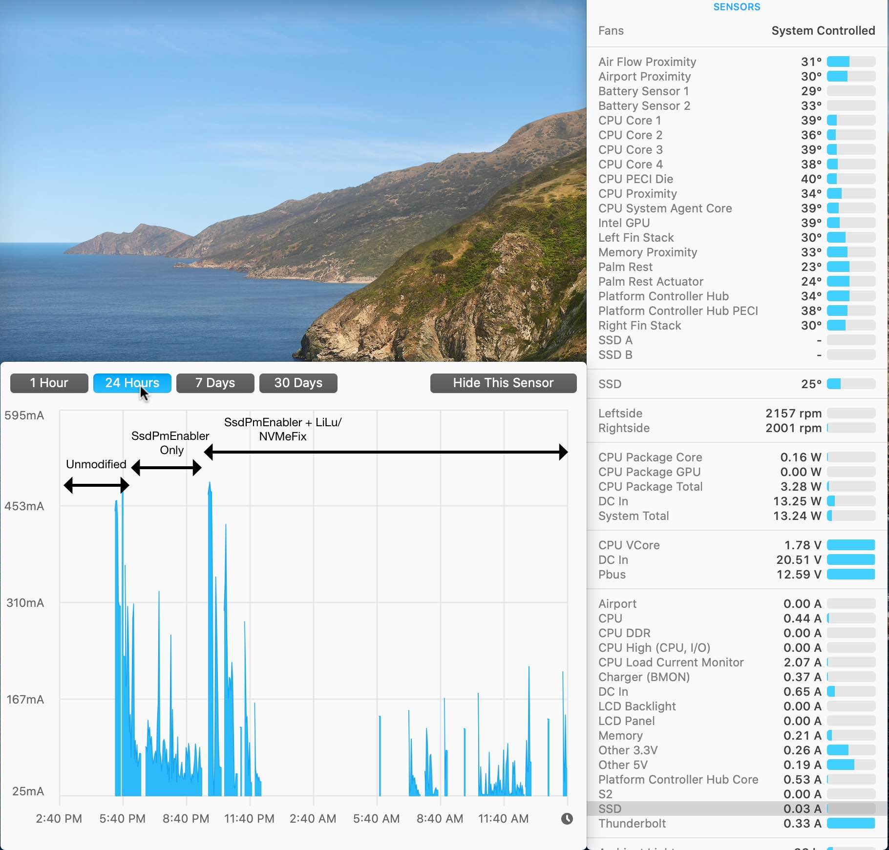 @herb2k) to install LiLu and NVMeFix. Now, when idling, I routinely observe in iStat 0.03A and I have seen 0.02A a few times. These last two readings are in the neighbourhood of the original Apple SSD. I have uploaded the iStat menu graph and the before and after BlackMagic tests.