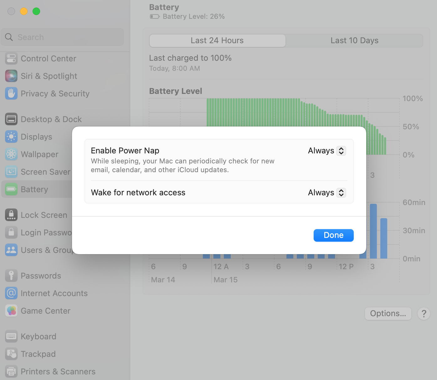 sudo pmset -a powernap 0 standbydelaylow 1500 standbydelayhigh 1500