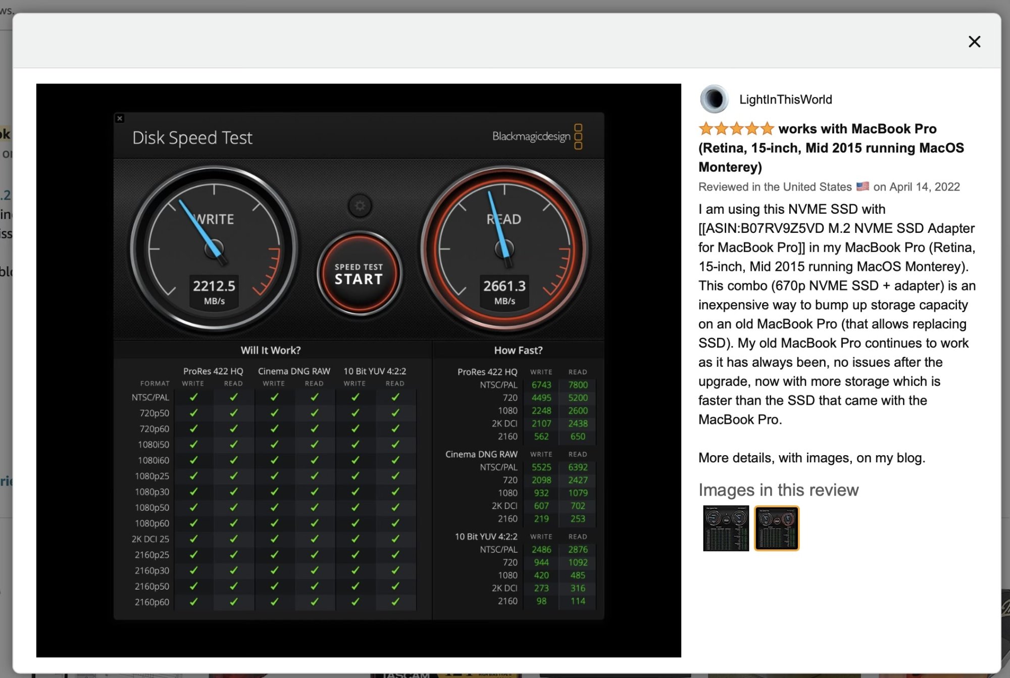 That does have the faster of the write speeds of the Intel bunch, but I think I'm going to stay away from QLC. TLC seems to have better reliability, performance and endurance.My budget is tight too, which is why I'm going with the 2TB Intel 670p. It's currently $69.99 at Amazon. Somebody left a review saying it woks in his 2015 MBP. It has a glowing review at PCMAG. It comes with a 5-year warranty.