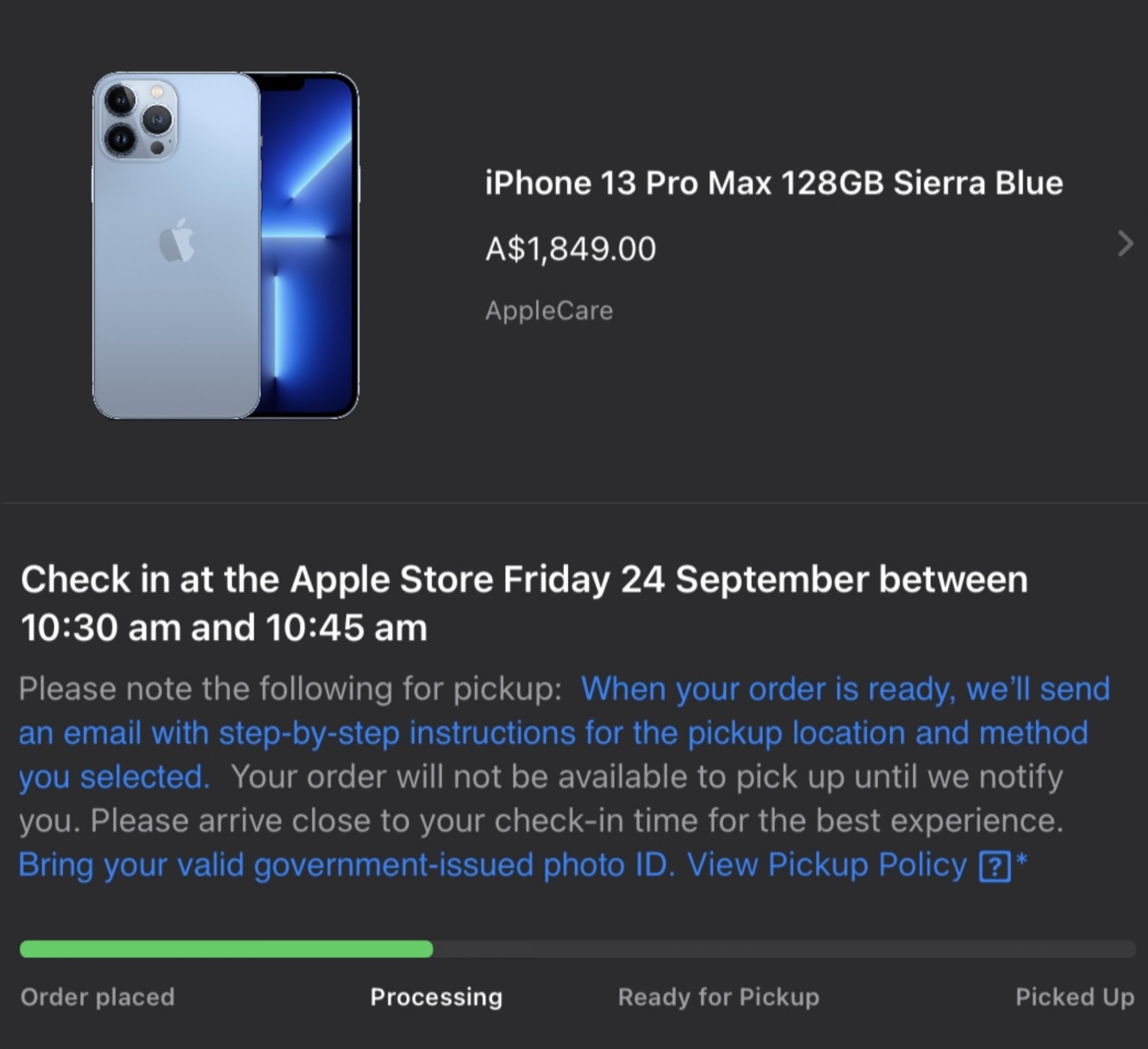 I've picked up in person at the Apple Store on launch day and there's a separate line for pickups vs people just walking in to buy an iPhone. I've never had to wait more than 10 minutes before talking to an Apple Store employee. It's pretty painless. I think they will hold it a few days (you should check with Apple). If you are part of the IUP, you'll need to return your iPhone 12, so just be ready!So I slept through the pre-ordering opening time this morning, and delivery is now mid-October. However I can pick up at the Apple store on the 24th Sept.