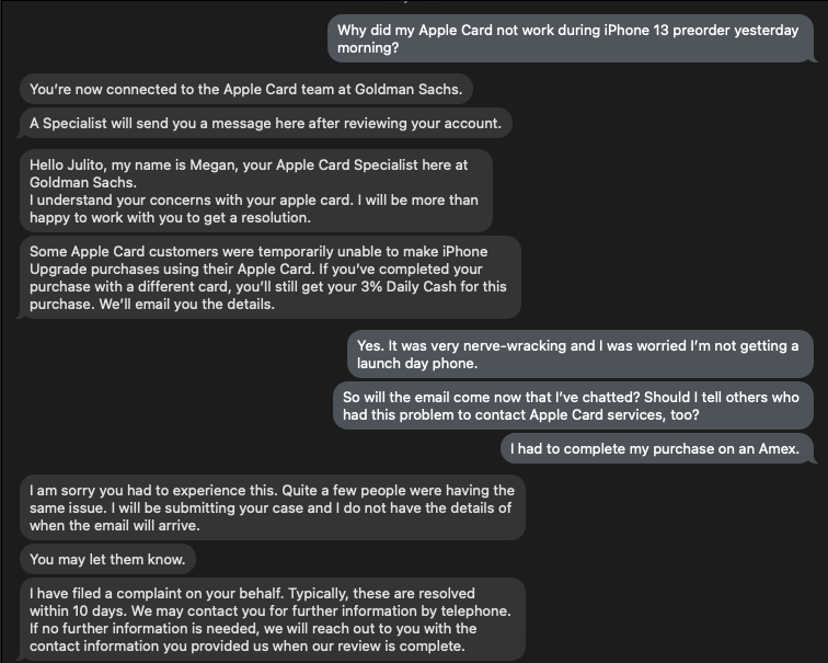 I was a victim of that Apple Card glitch yesterday as well. After getting booted out for trying to paste and complete the CC info too many times, I switched CCs and made it happen. Happy to still have a launch day phone coming. I just messaged w/ Goldman Sachs Apple Card service - and if this happened to you, they advised me to let you all know - you should also register a complaint. GS say they will e-mail me and provide me a way to still get the 3% Daily Cash back.