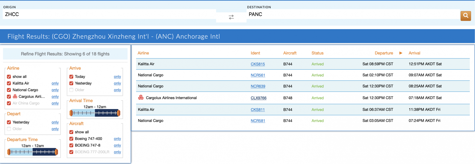 I hope so, my refresh rate on UPS is hitting a disturbing amount. They might cut me off soon.I don't see any scheduled departing flights showing up any from CGO and PANC, yet. But rest assured they are going to show up as promised in post #3,383. Expect to see some sort of activity later this evening especially for all the early birds. Not sure if we will all be leaving China together.