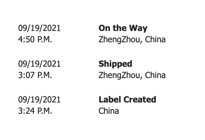 Same for me... But eventually we will get to the next phase.This is all I've gotten on my 8:01 AM iPhone 13 Pro Max 128GB so far. "On the way" from ZhengZhou China at 4:50 PM 9/19. Really hoping for some movement today!