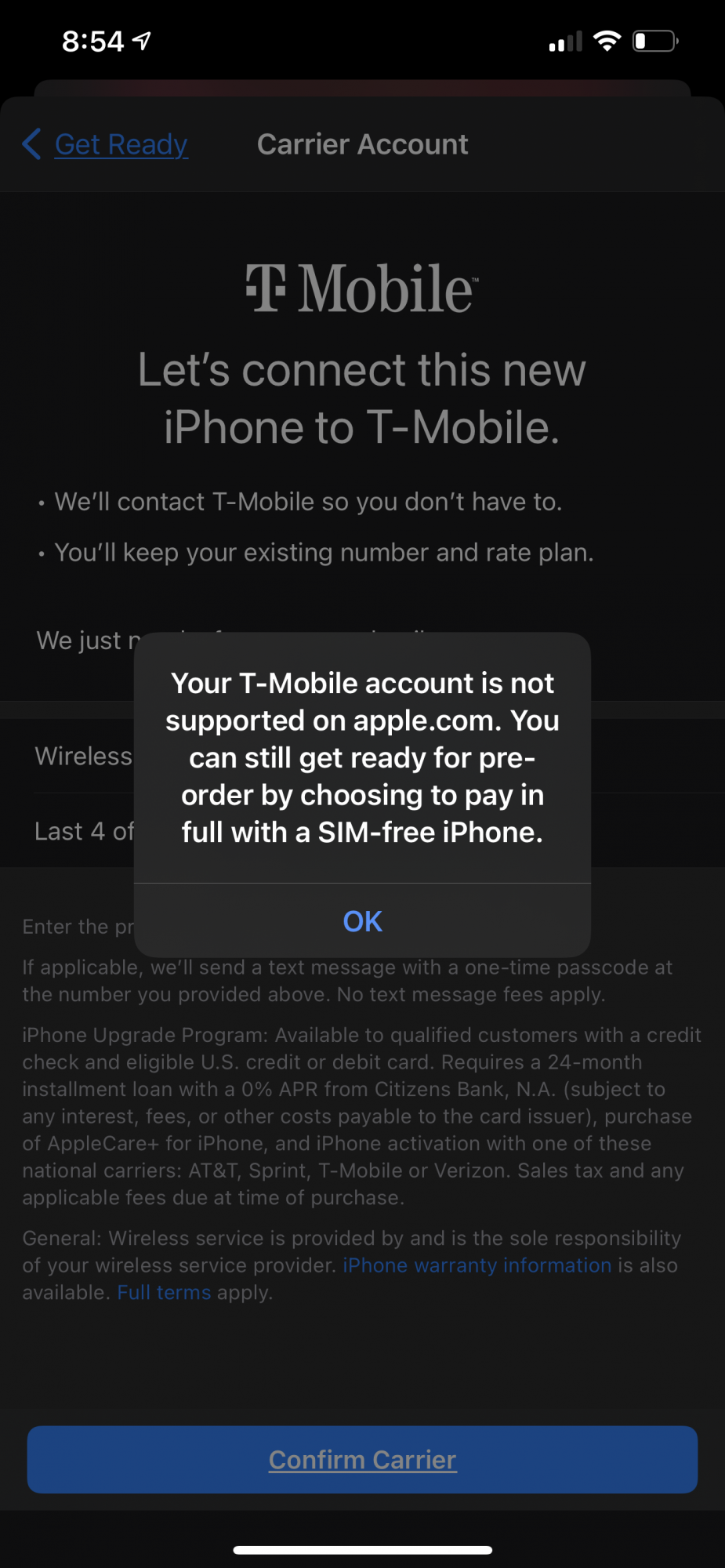Yeah, it’s telling me I can’t connect through Apple.com. Have to buy full price unlocked. Ha. No.