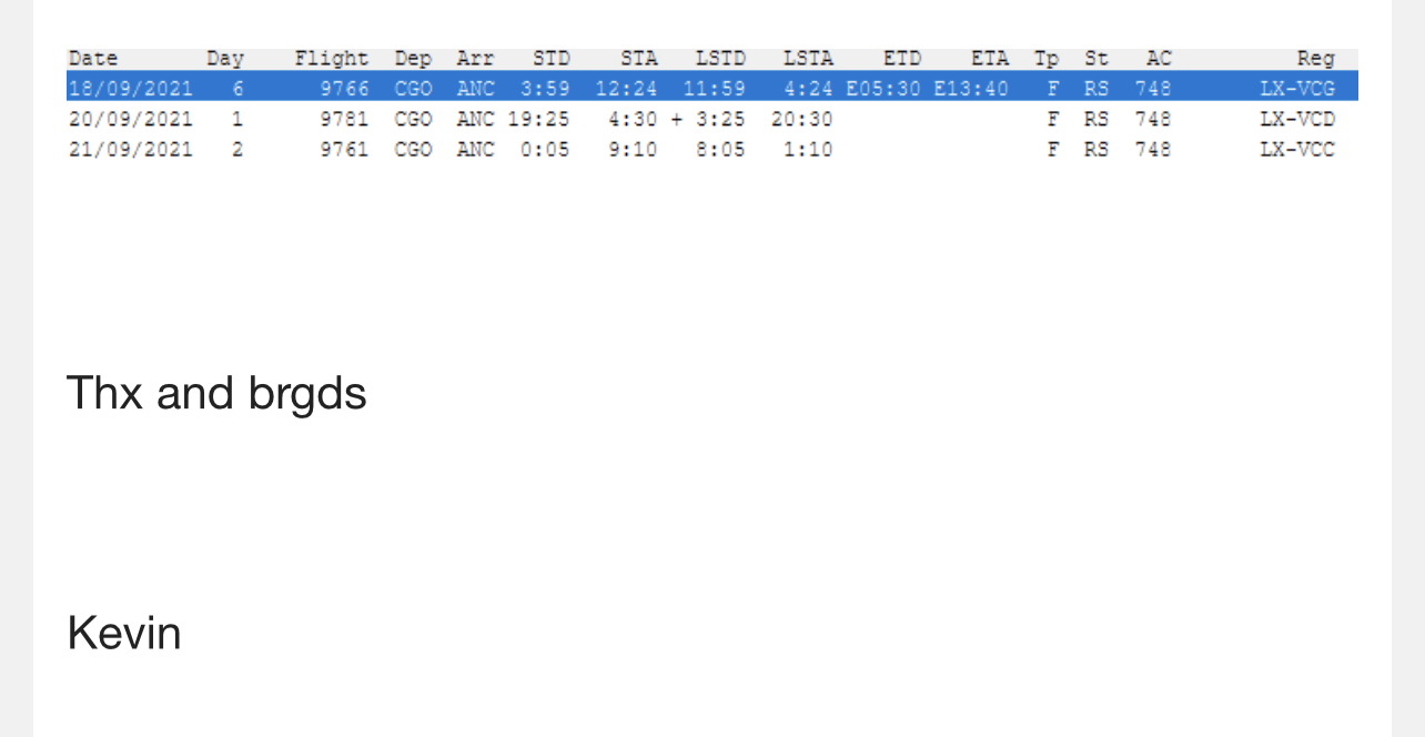 Flight #9761 CGO to ANC is reported to department tomorrow. I’m 99% sure that’s going to be our final plane. As this is the last plane CargoLux has posted via internal system.
