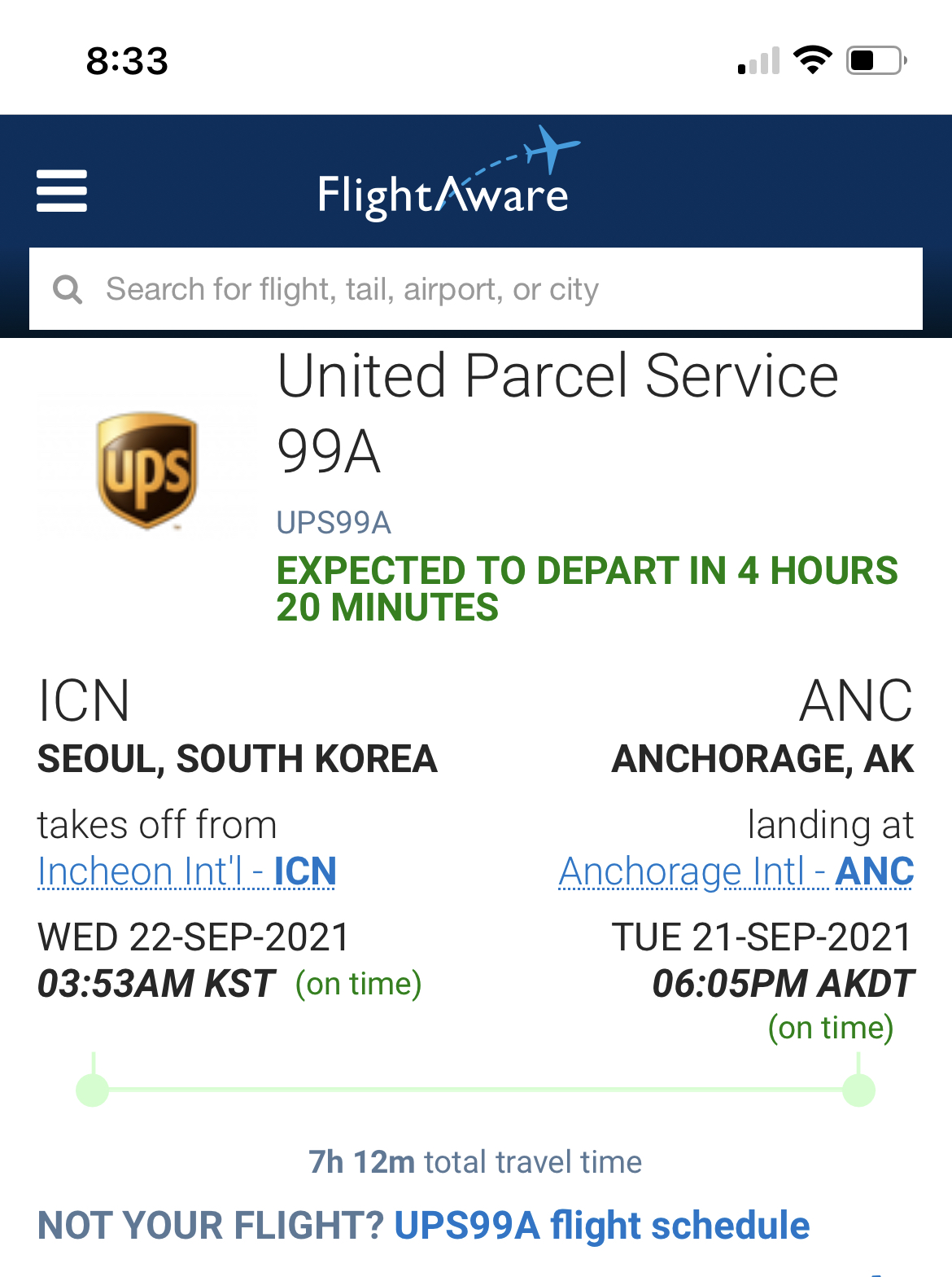 Scheduled for takeoff in 3 hours. Hopefully!It looks like even though UPS99 was supposed to depart at 09:50pm KST (+13 hours from EST aka 8:50am), it looks to still be delayed? Not sure when it'll leave. I read a post saying they filed for 10pm KST departure, but it's currently 12:30am KST (9/22) and the status is still Delayed in FlightAwareView attachment 1838631. Hopefully, it'll be departing soon and those who are in Incheon with my iPhone will be on onboard! 🙏