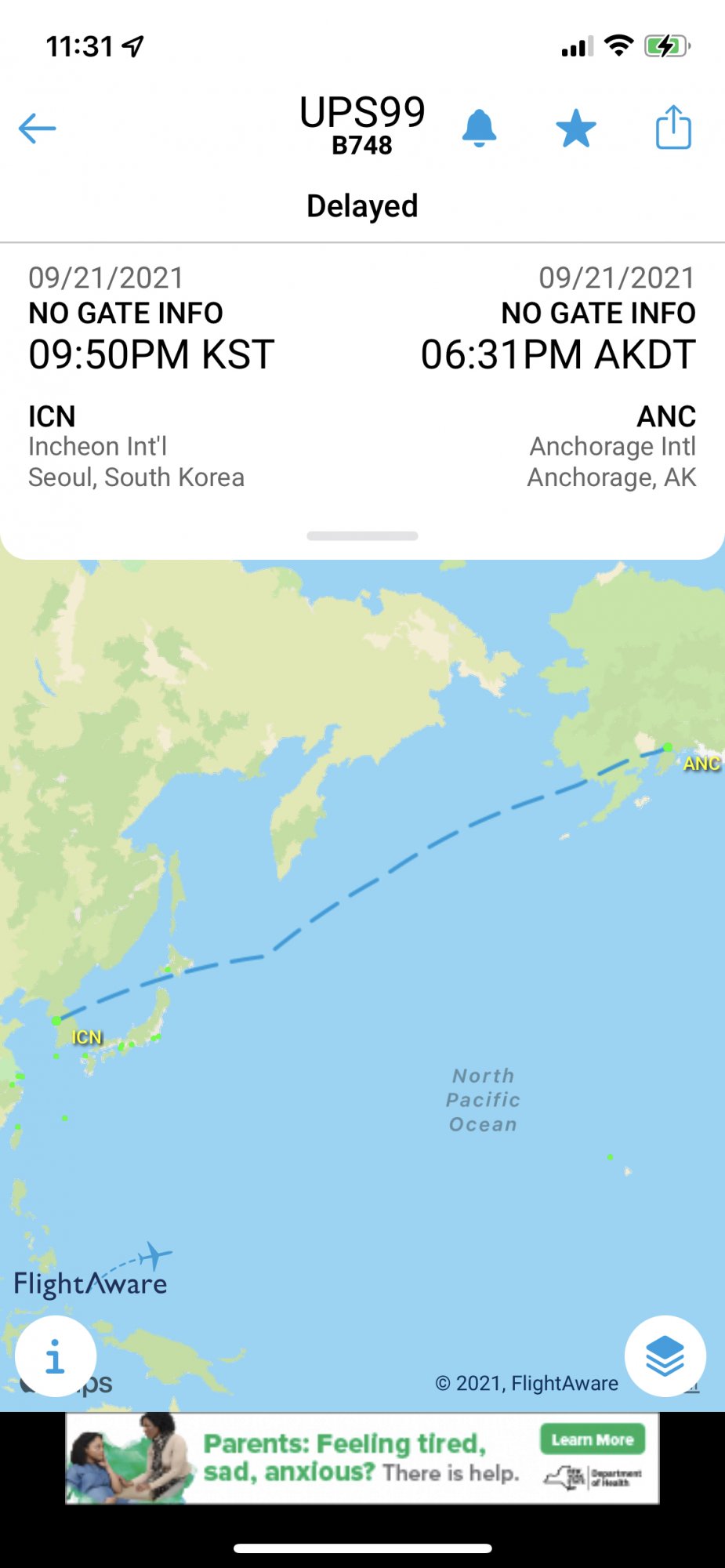 Wait so there is now a UPS99A taking off at 3:53am KST (2:53pm EST 9/21). I wonder if that's the flight we'll be on? I wonder what happened to UPS99? It still says delayed for some reason. Oh well!!