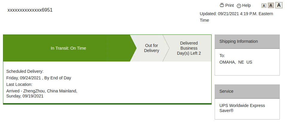 It’s not showing up in UPS My Choice either. We got a tracking number for my husband’s on there