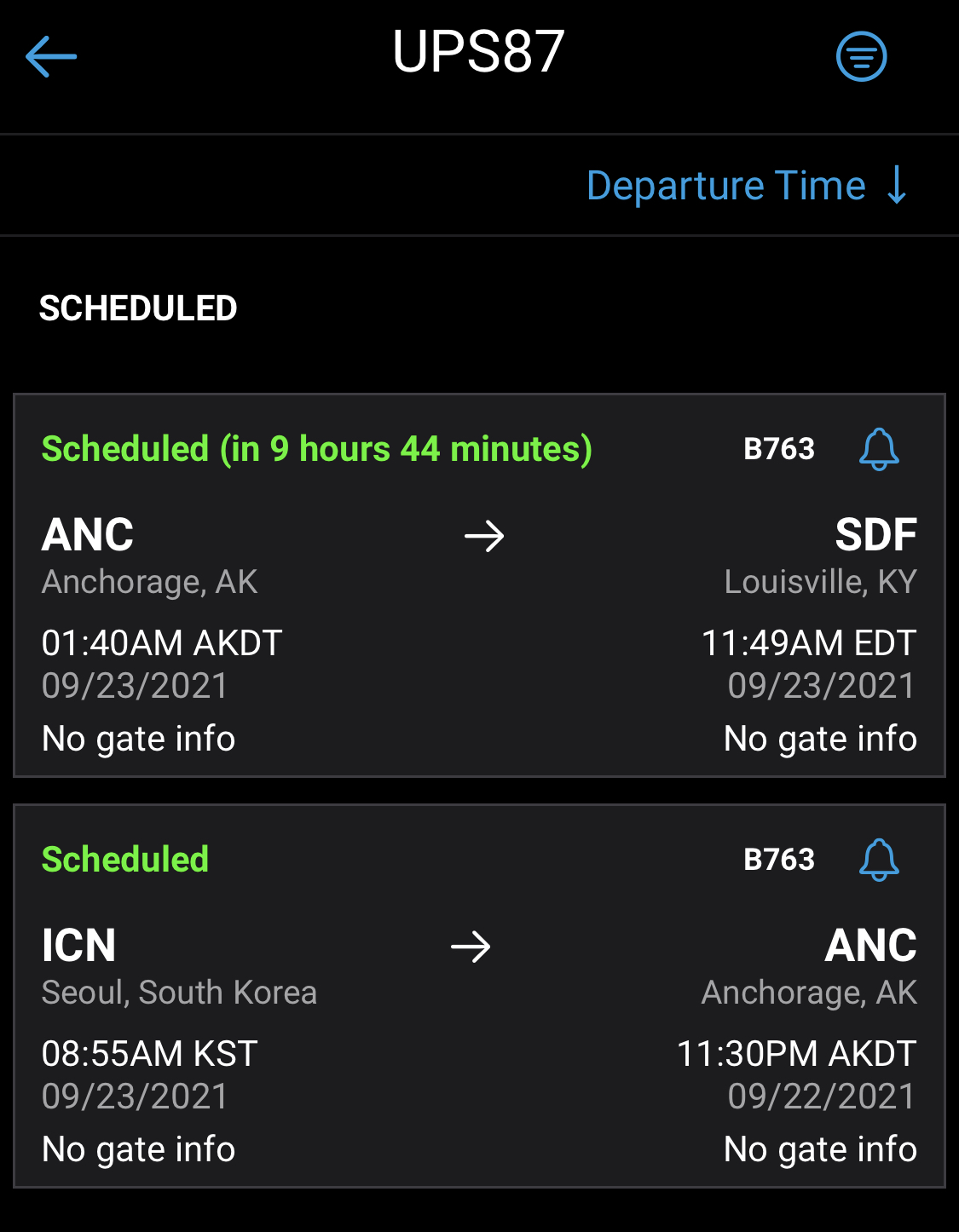 @FlightLevel310 You have to take control of the UPS flights next year for the launch of iPhone 14. I wish you were our actual pilot flying them and bringing them to the states, Captain!Maui is an interesting one. Definitely goes to Honolulu first. My best guess is that you'll be one of those exceptions where it leaves SDF tomorrow afternoon. I'd expect UPS2966 tomorrow afternoon SDF-HNL. They may also split it up tomorrow and go through Ontario first. From there I think Aloha Cargo probably is a contractor that does the final segment from PHL-OGG. From there Aloha would take it Thursday night into Friday from HNL-OGG. Any one of those flight numbers below would be the final segment. I hope it works out for the 24th.
