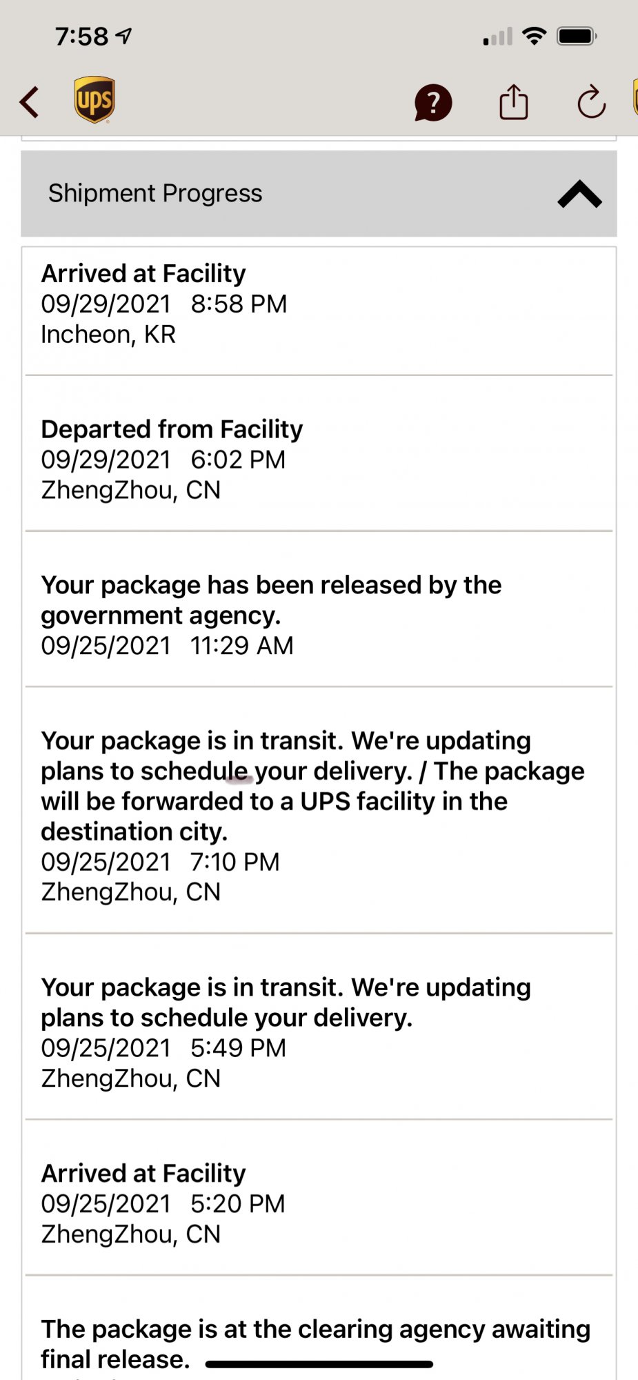 I got an update from UPS a little after midnight that my package had cleared customs and had been cleared by a government agency. Other than that, I had no clear idea now if my phone was in Louisville or ZhengZhou.
