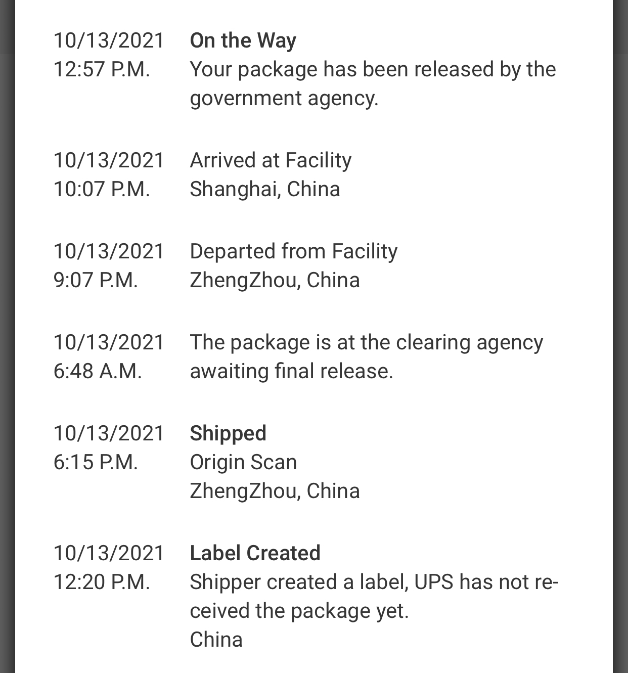 UPS just change my estimated delivery to oct 19 and still in chinaSame. 🙋🏻♂️ Hoping that it starts moving today and we get it on time or by Friday. From the stories I have read of people that went through the same, there seems to be an average 4-5 days to get past status.