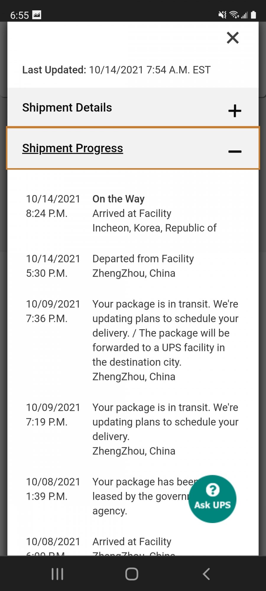 | 10/09/2021 7:42 P.M. | Your package is in transit. We're updating plans to schedule your delivery. / The package will be forwarded to a UPS facility in the destination city. ZhengZhou, China |