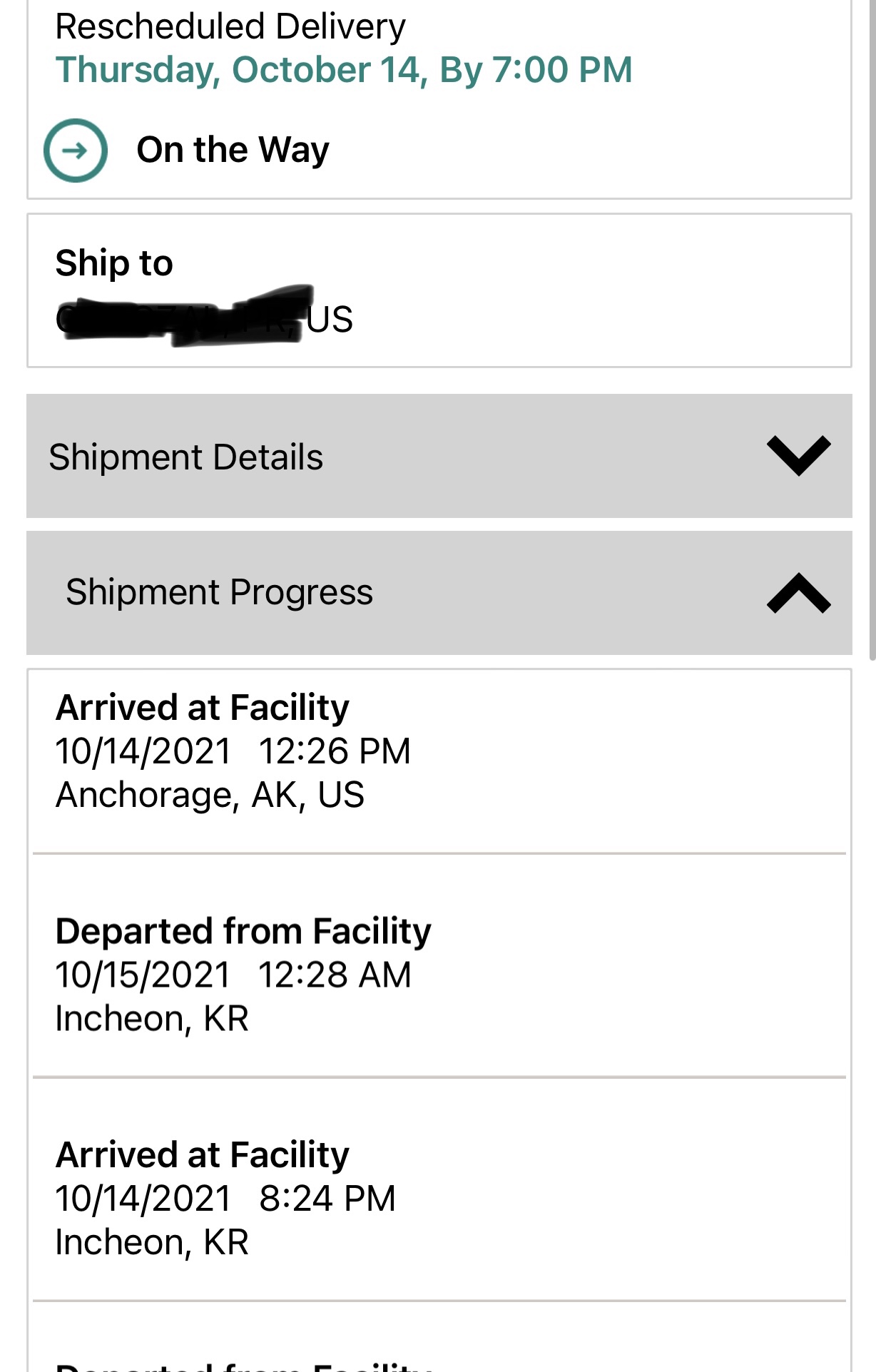 | 10/14/2021 11:56 P.M. | On the Way Your package is in transit. We're updating plans to schedule your delivery. Incheon, Korea, Republic of |