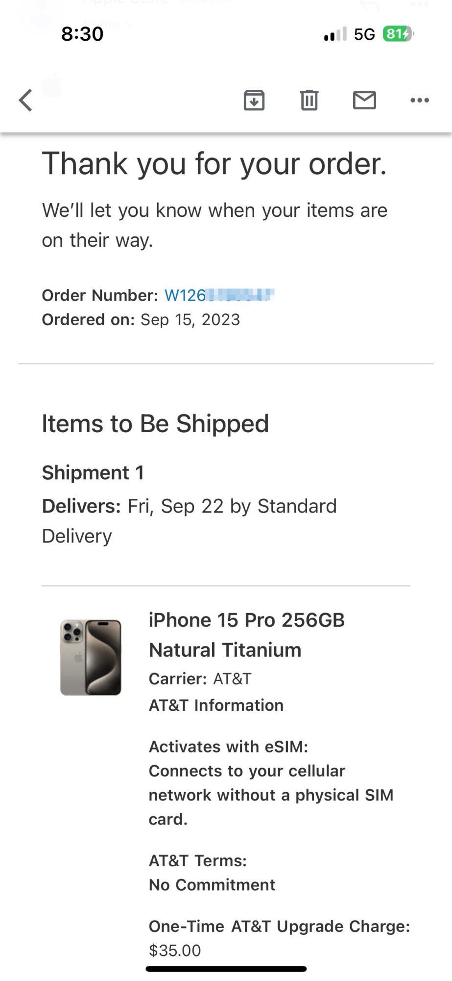 Ordered: iPhone 15 Pro Max - 1024GB - Blue Titanium at 8:05AM ET, and the iPhone 15 Pro Max - 512GB - White Titanium at 8:07AM ET this morning. Got an email from AT&T for both about 3 minutes after each order, and the site shows on the my orders page as Ordered, Estimated to ship: Thu., September 21, 2023Anyone order from AT&T? Mine is saying estimated to ship Sep 22nd- Oct 6th. Got my order in about 25 mins after launch time. Hoping to get it on release date