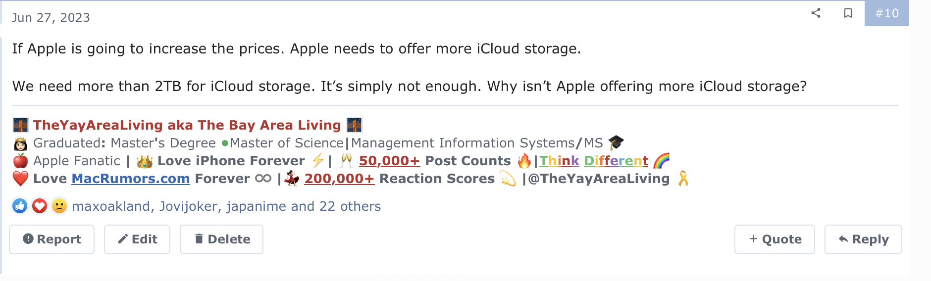 My 2 TB fam plan is full. I added an additional 2 TB for $10/mo on top of One. More storage will only be an increasing need as time marches on. Said another way, we’re not going to be needing less storage in the future. 🤪Agreed! I begged Apple for almost 3 years to increase the Apple iCloud+ storage. I begged them at every opportunity I got in here. Finally, Apple listened. Proof below. Check out the time stamp.