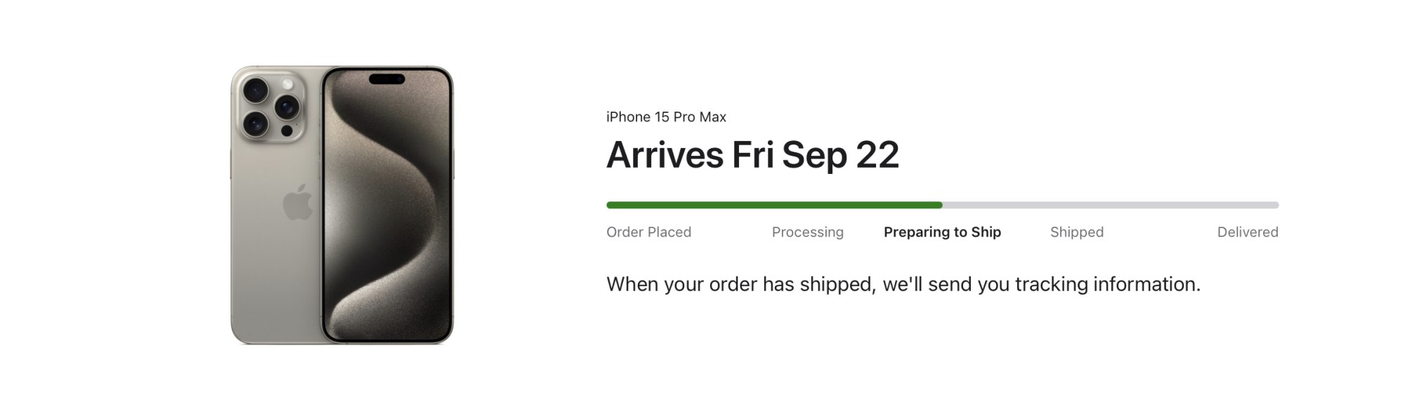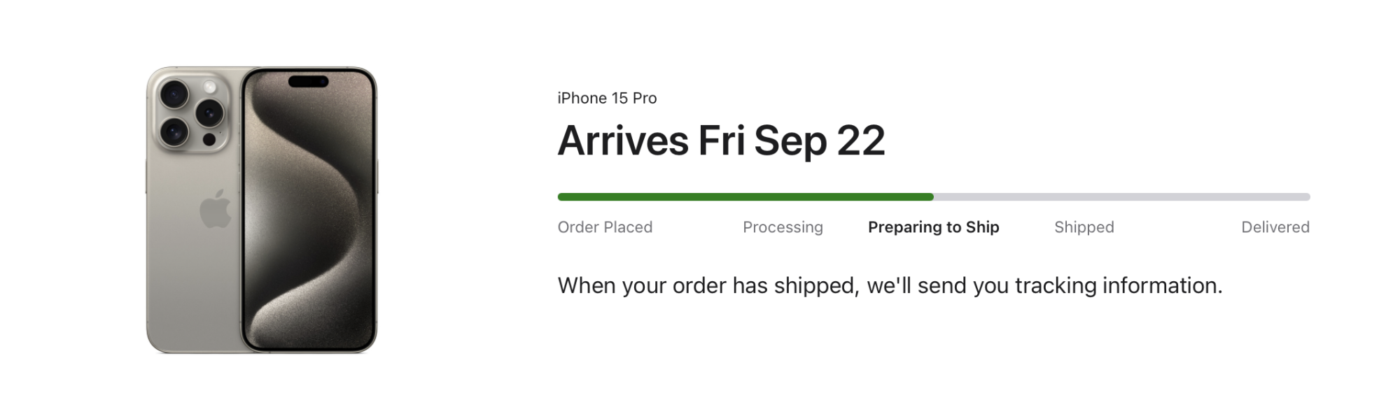 My non-pro 15 has finally moved to "preparing to ship" status, no tracking info yet on it or the other two iPhones I preordered.That makes me even more concerned.