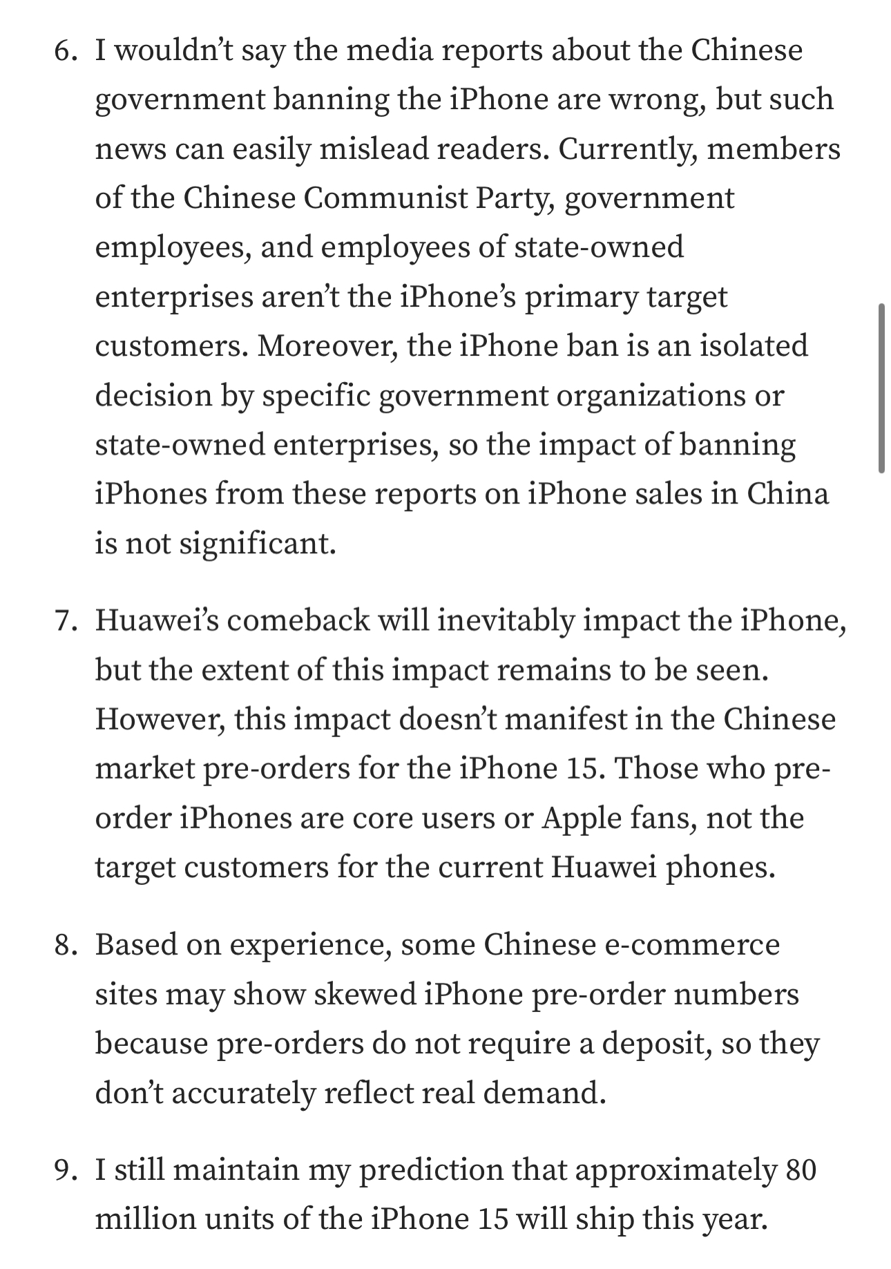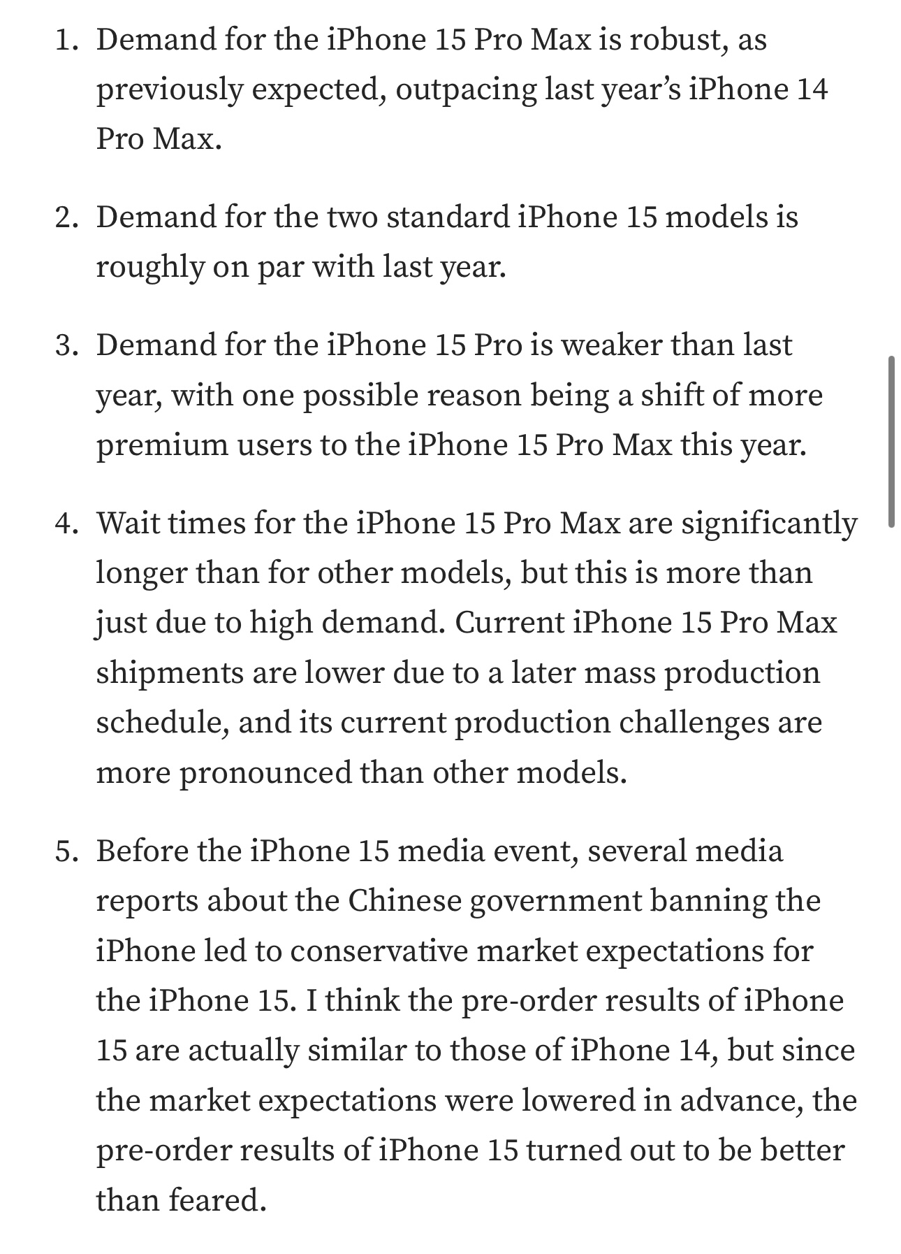 I kind of regret not getting the Pro Max. Go big or go home lol. I may have to try it next year for sure. I’m seeing where the White Titanium isn’t really white white more silvery maybe. That’s kind of disappointing. When I made my decision I thought it was pretty white.Check out the latest Phone 15 Thoughts on the iPhone 15 first weekend pre-order. Released 2 minutes ago by Supply Clain Expert. Mr. Kuo.
